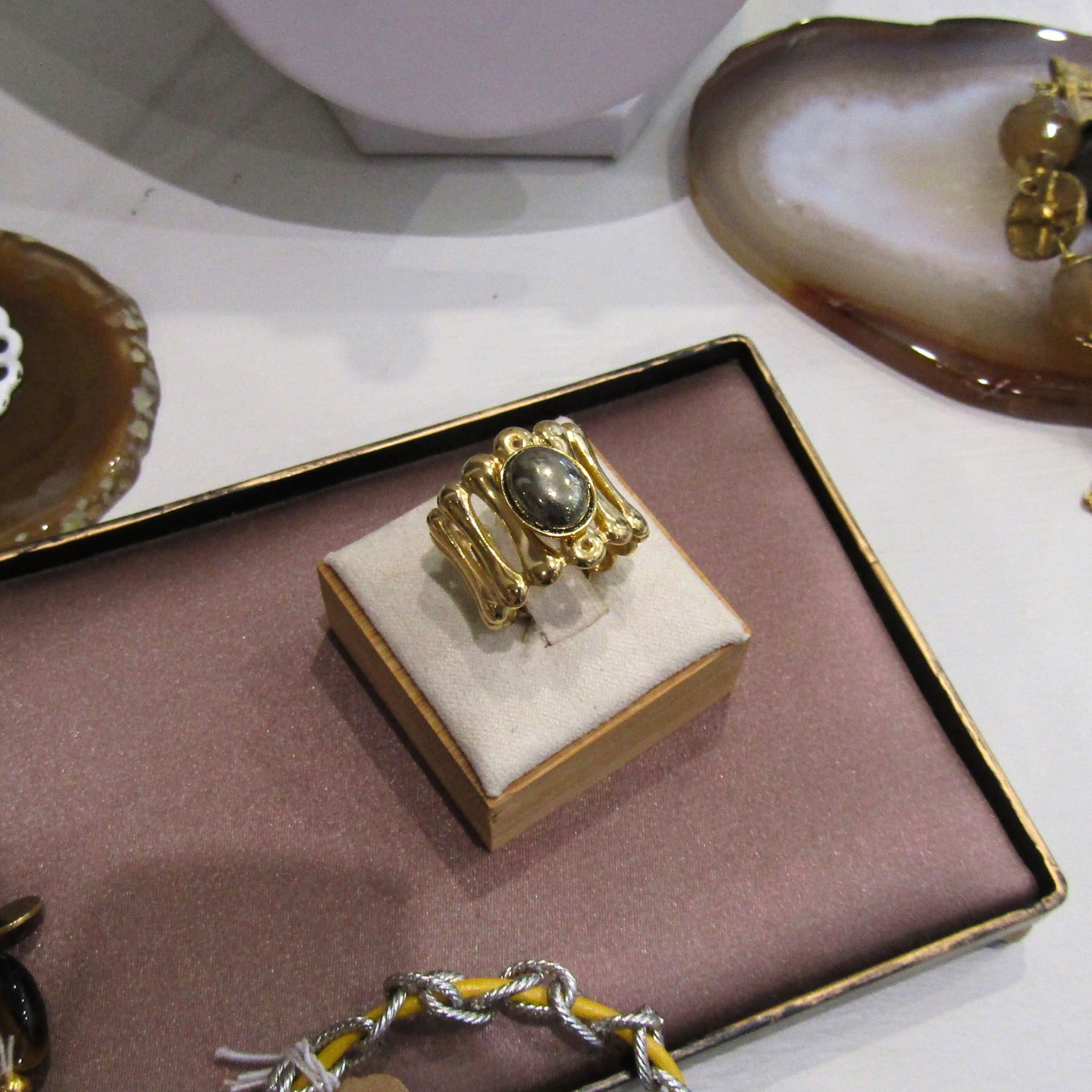 Bague originale avec ses petits "os" joints les uns aux autres, large mais ajourée pour un joli rendu sur le doigt, elle est ornée d'une belle pierre de Pyrite de forme ovale sur le dessus.