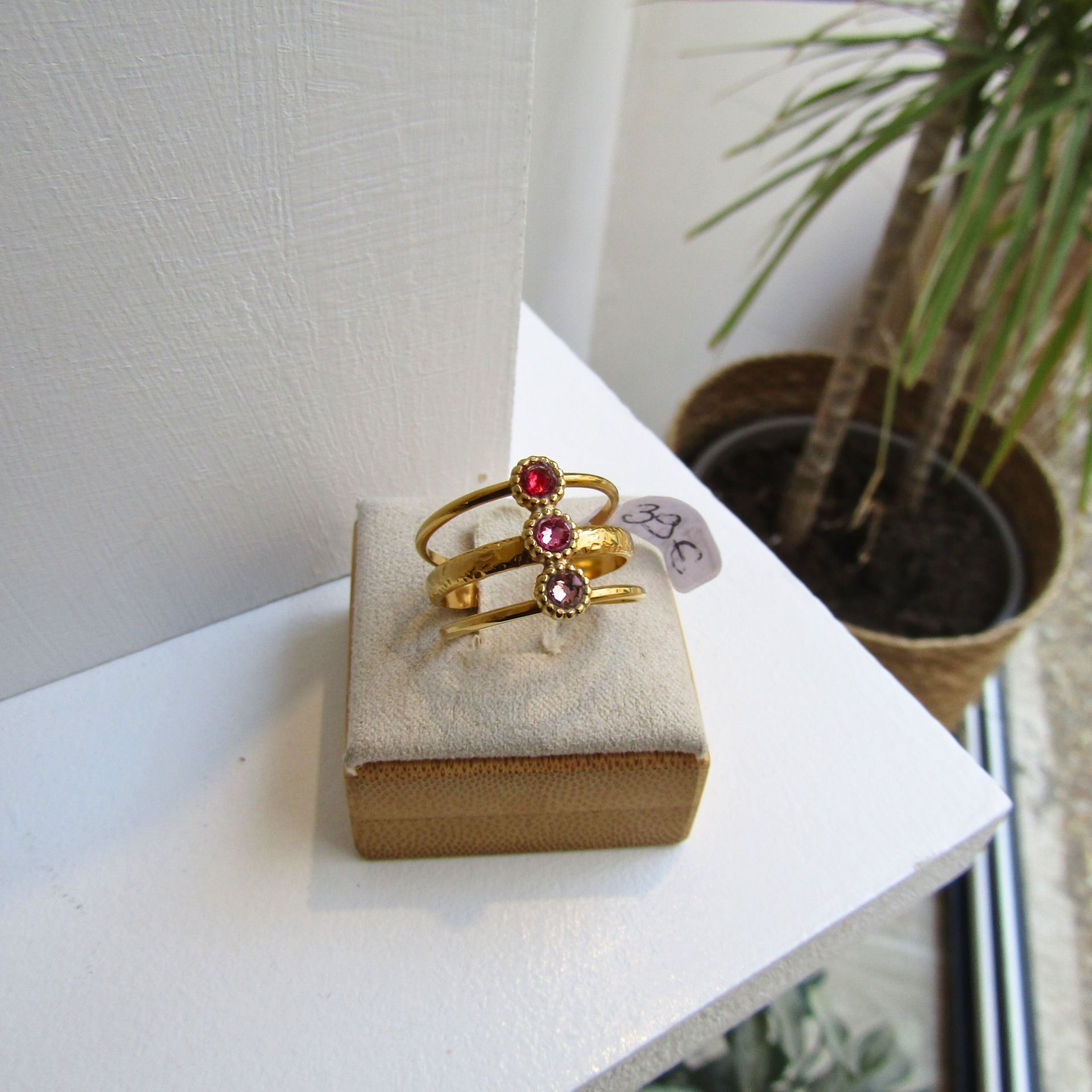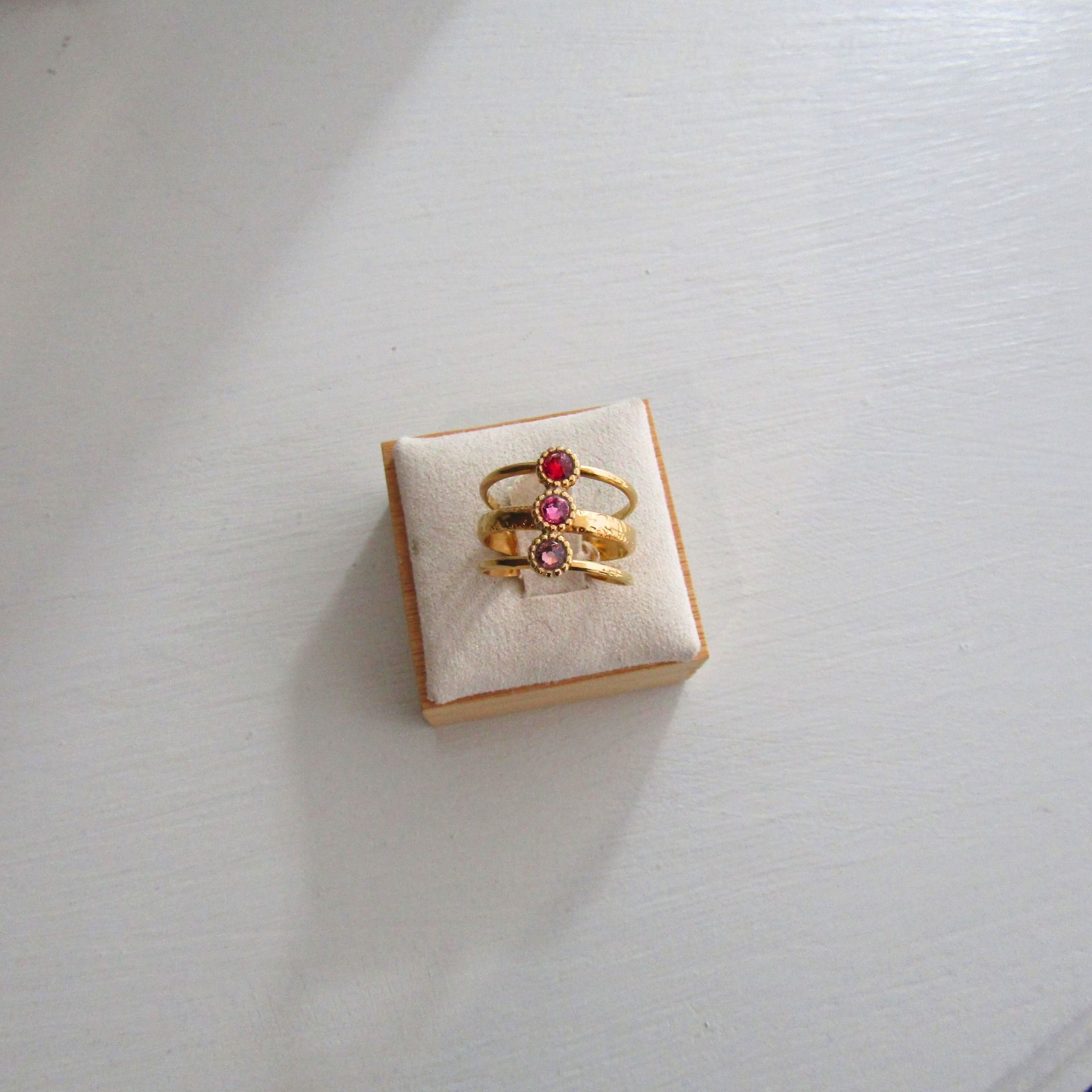 Bague en acier inoxydable plaqué or avec 3 petits cabochons en cristal de Swarovski en dégradé de couleur rouge à rose.