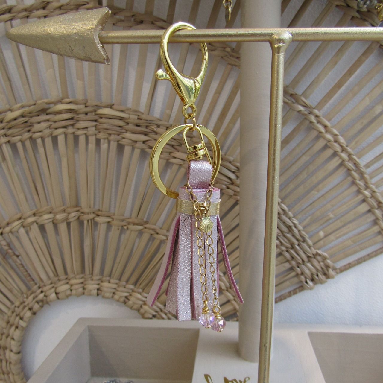Bijoux de sac mais aussi porte clé en cuir pailleté rose pâle, chaînes, perles de verre assorties et attache argentée.