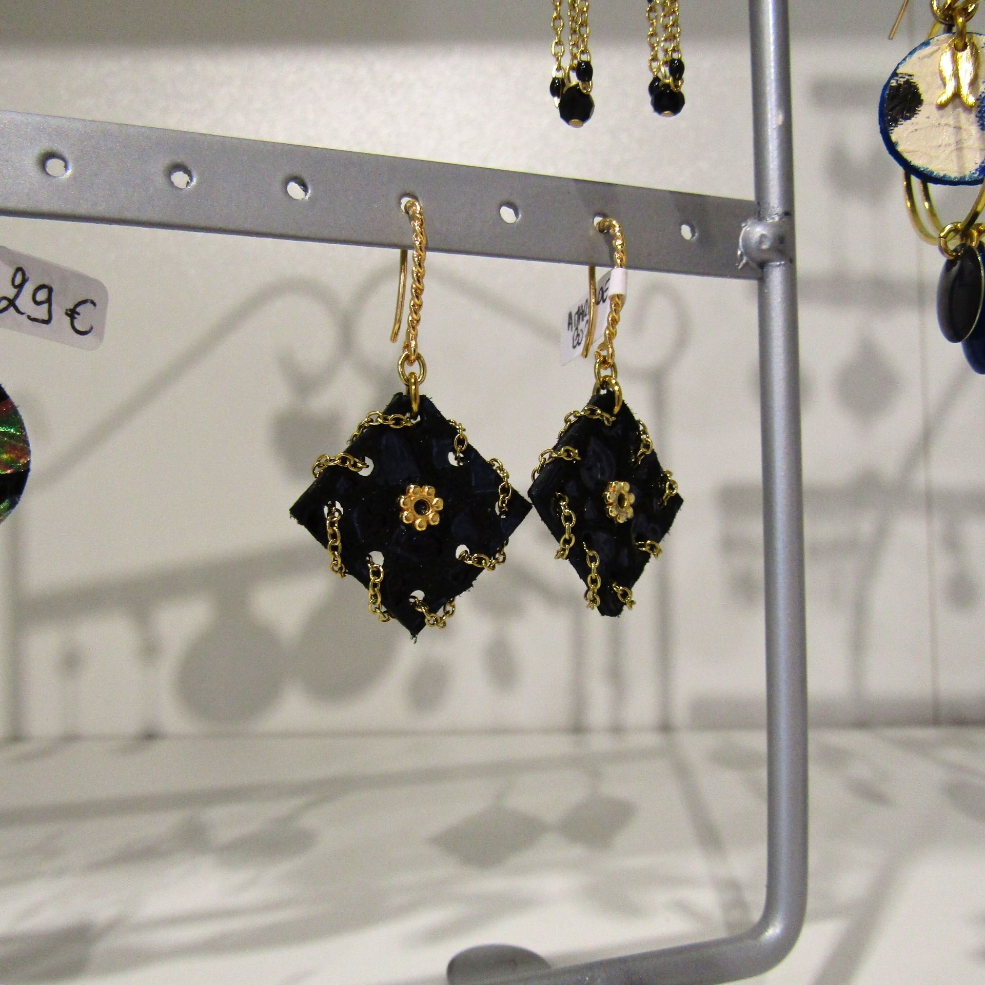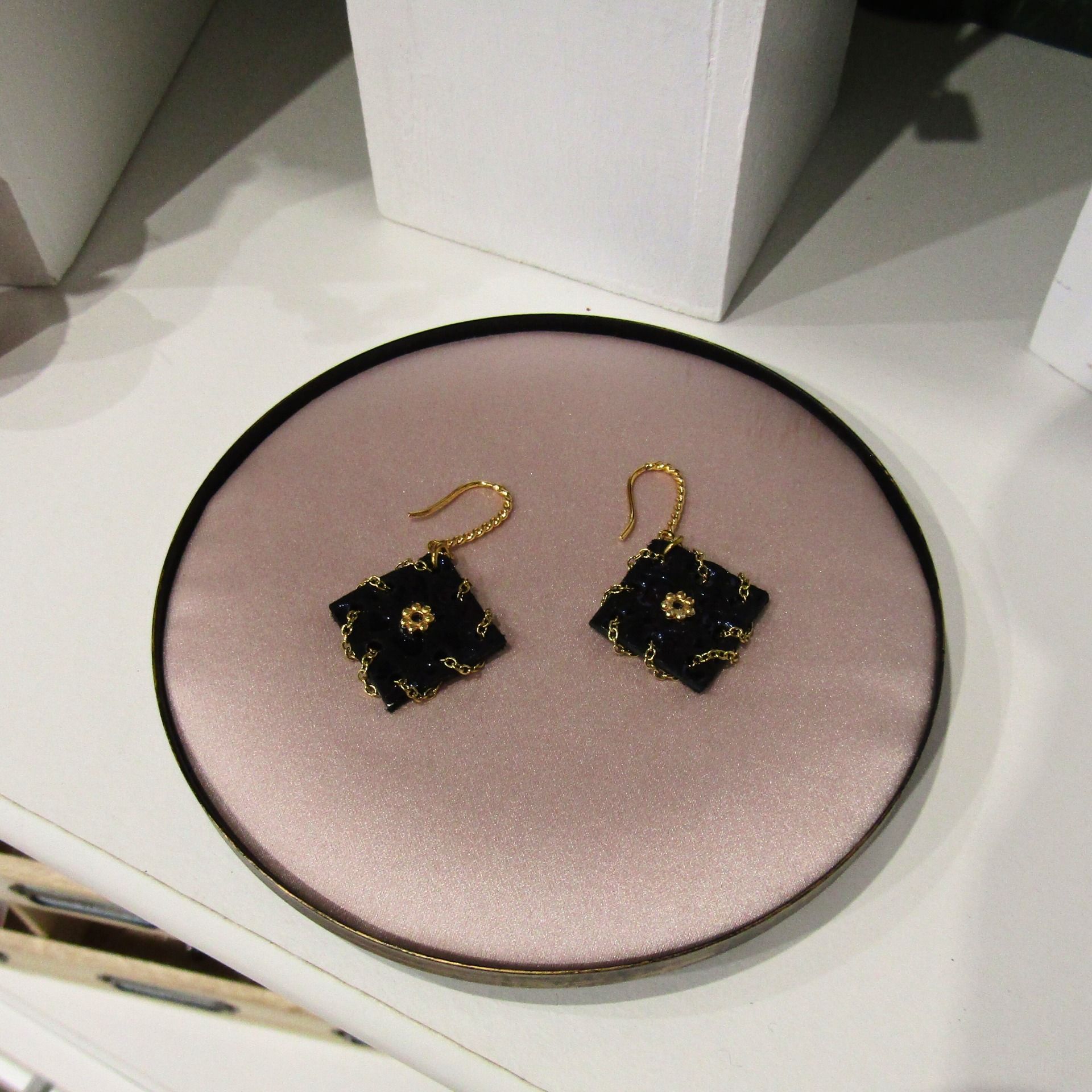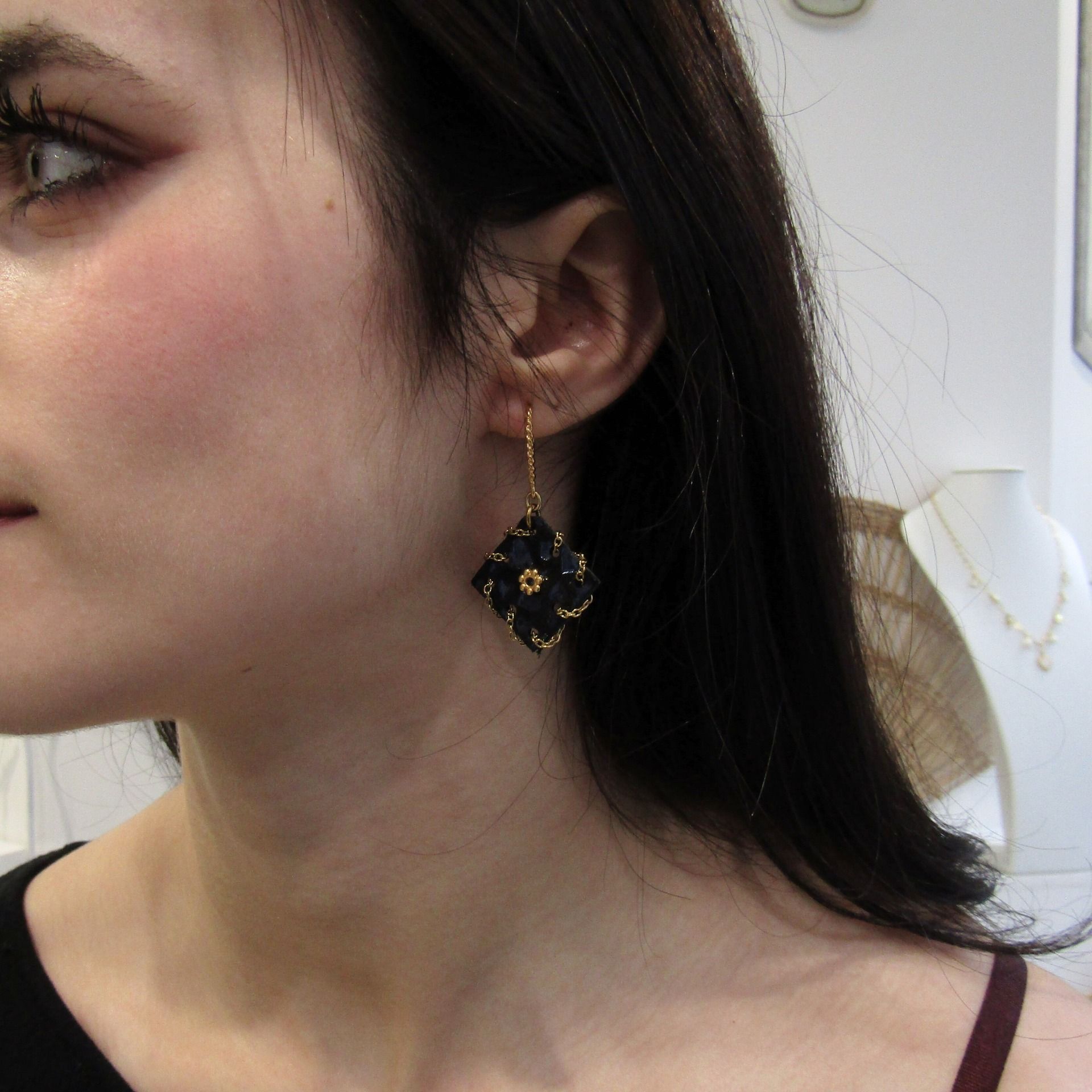 Deux losanges de cuir noir motif coeurs brillants noirs, bordés de chaînes fines en acier inoxydable plaqué or et mini fleur dorée au centre ; ces boucles sont montées sur un crochet d'oreilles plaqué or torsadé.