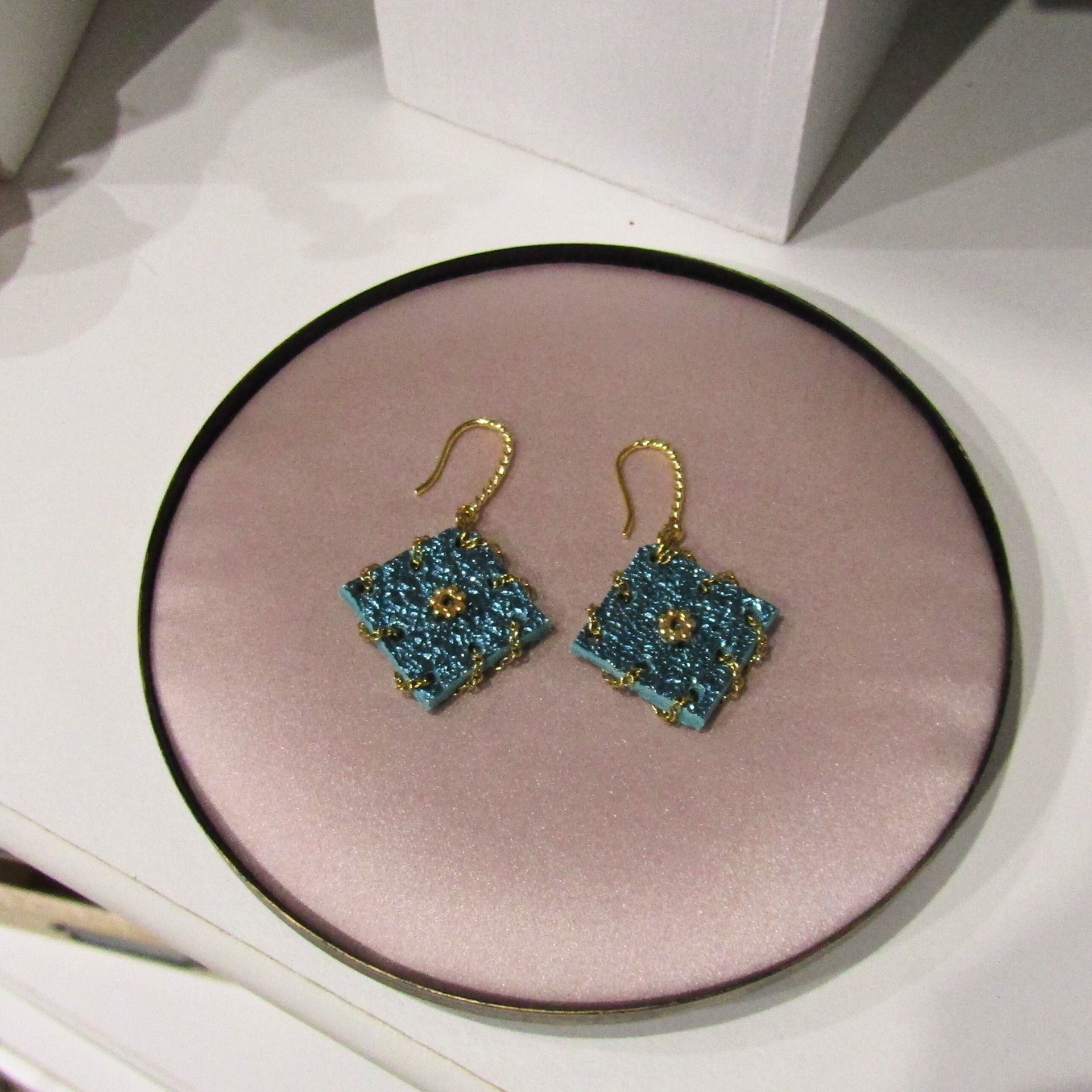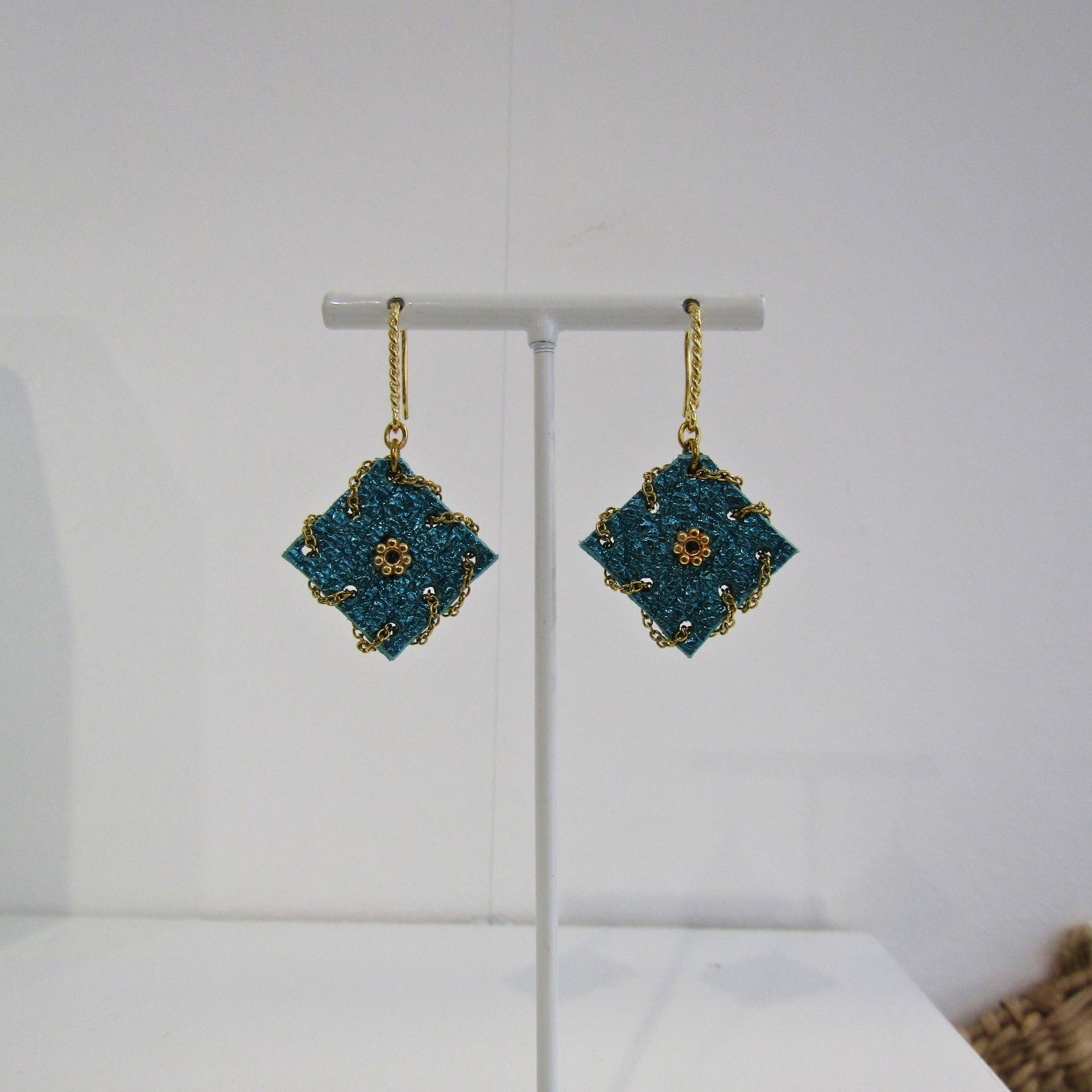 Deux losanges de cuir granité vert pacific, bordés de chaînes fines en acier inoxydable plaqué or et mini fleur dorée au centre ; ces boucles sont montées sur un crochet d'oreilles plaqué or torsadé.