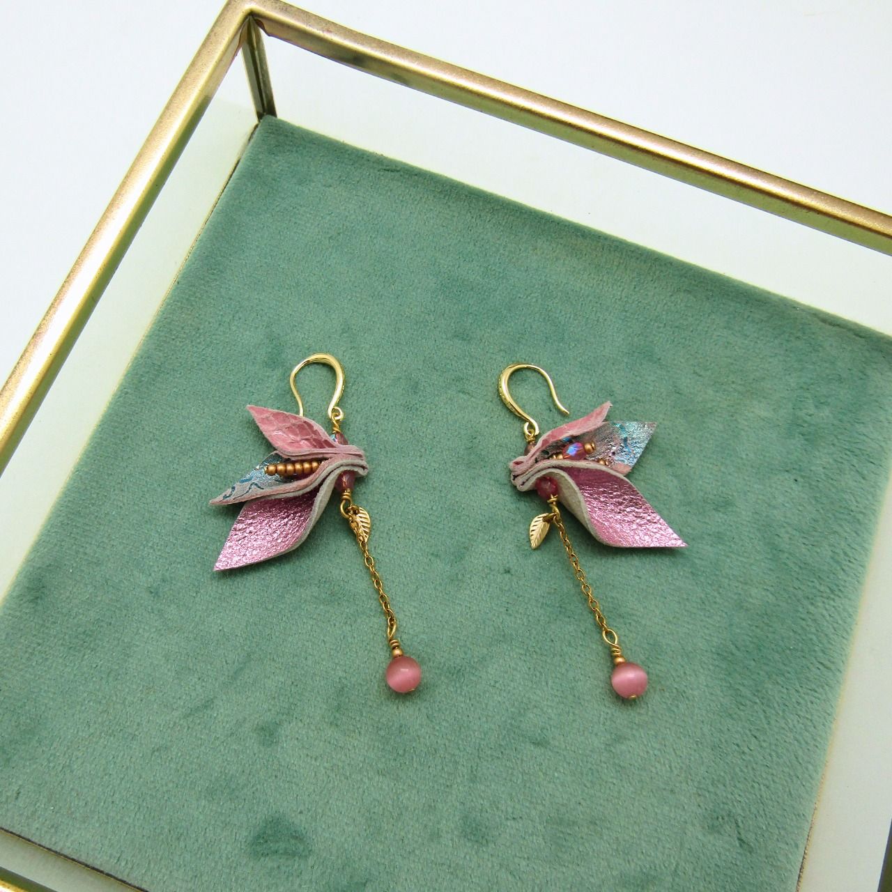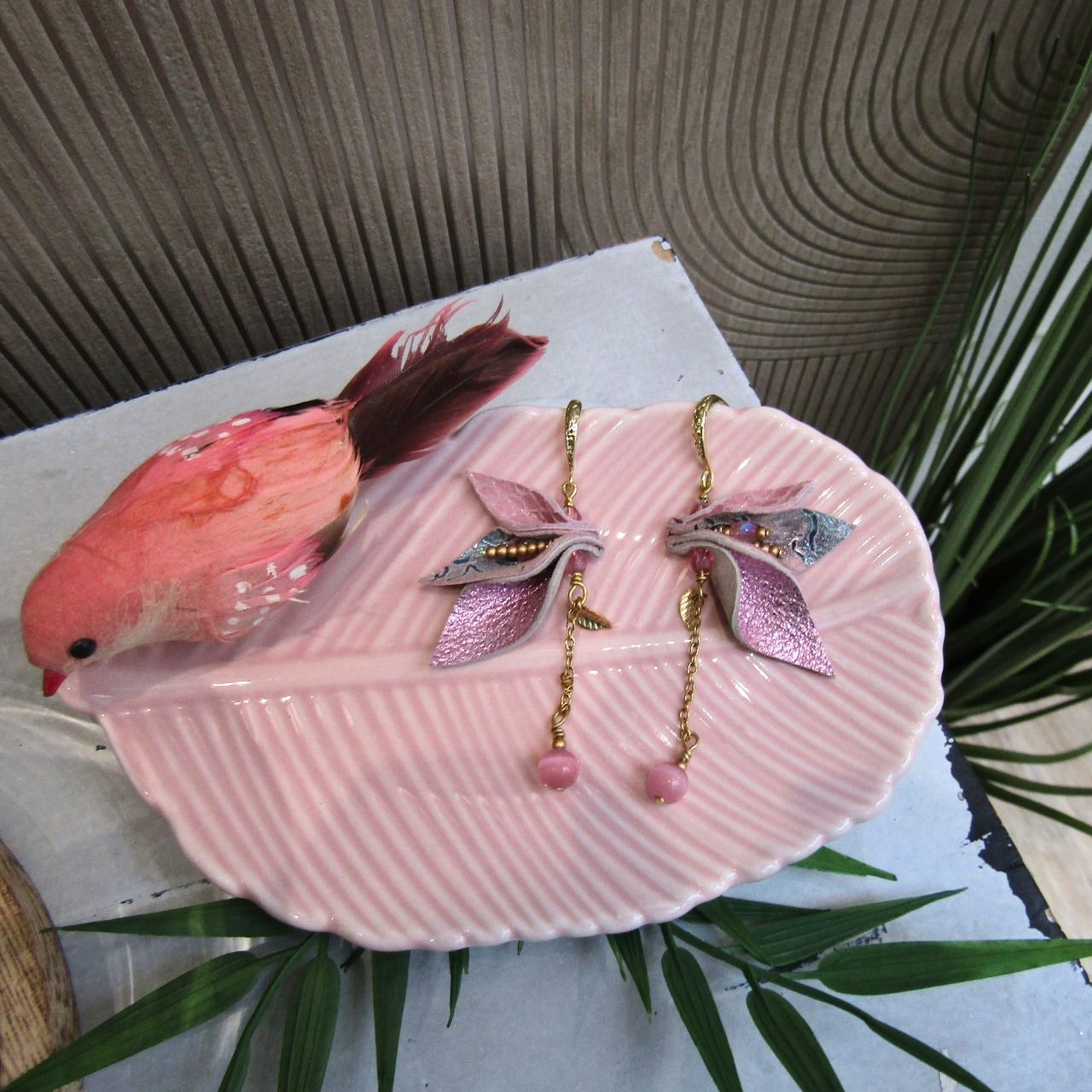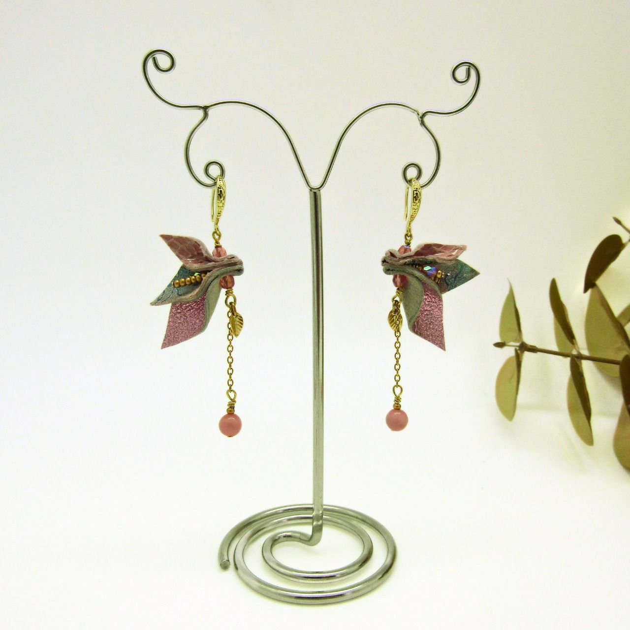 Trois pétales de différents cuir roses et des petites perles de verre composent cette Ancolie affinée par une longue chaîne en acier inoxydable doré. Le petit crochet d'oreilles est en laiton ciselé plaqué or.