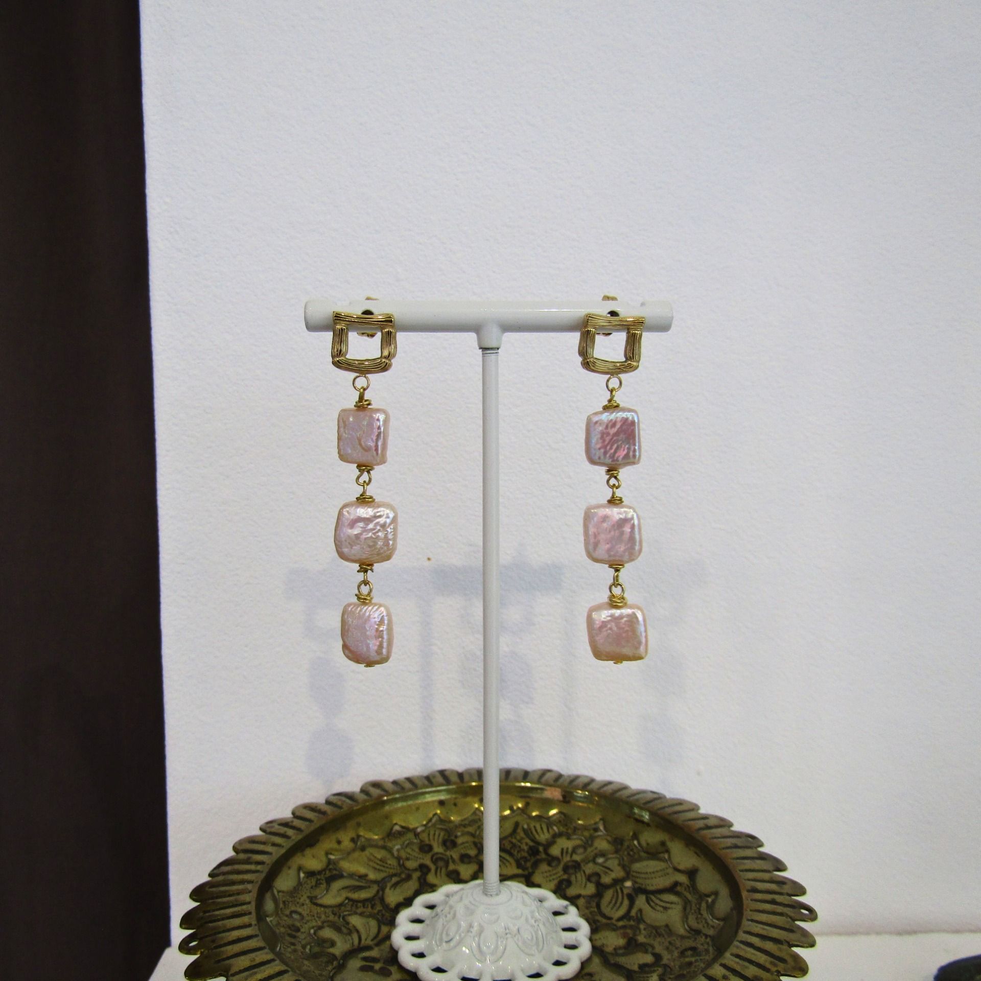 Trois jolis petits carrés en perle d'eau douce blanc légèrement rosé (poudre) se balancent sur un clou d'oreilles en forme de bambou carré en acier inoxydable plaqué or.
