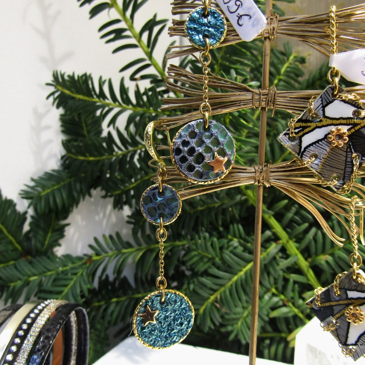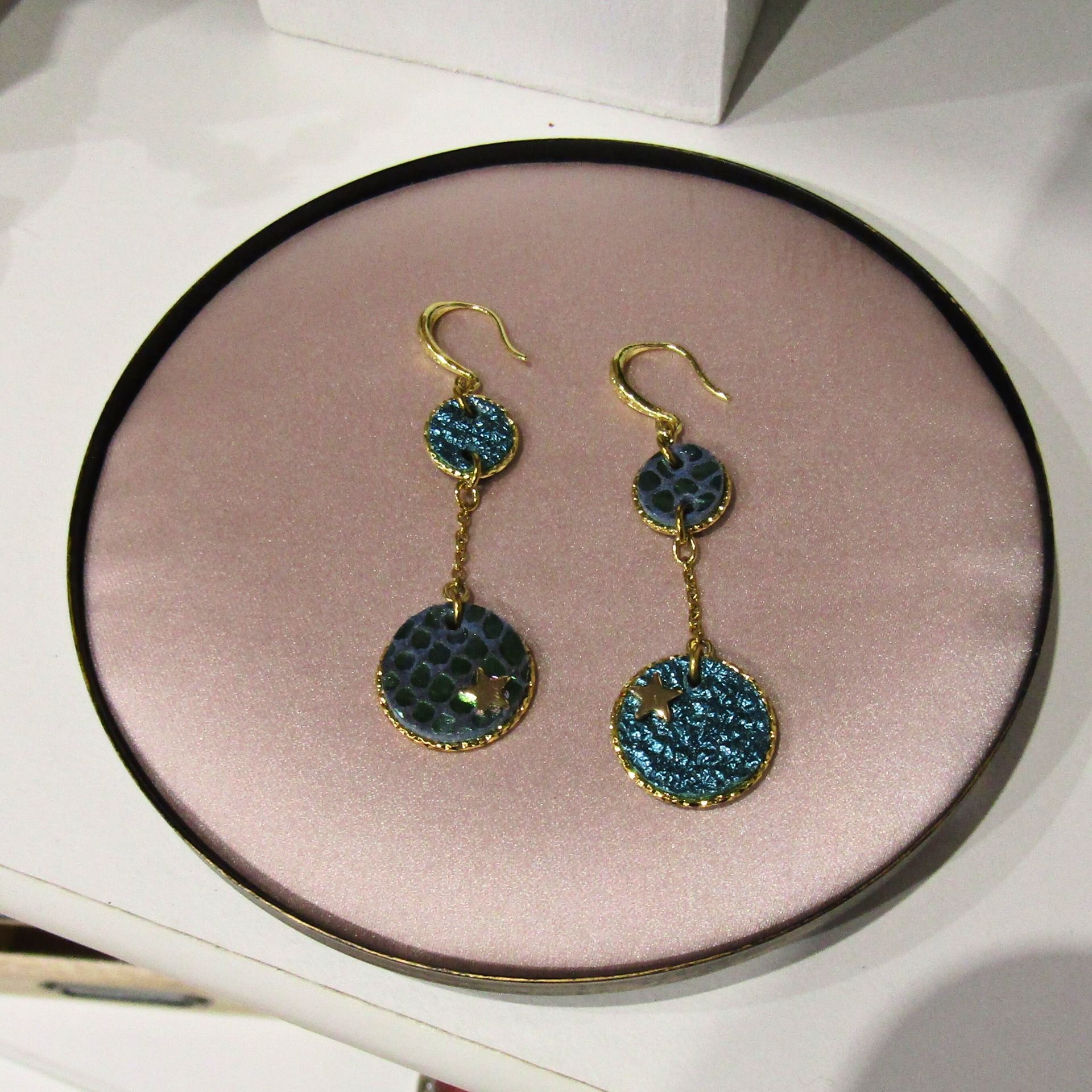Deux disques de cuir de tailles différentes, serties d'anneaux ciselés en plaqué or, tirent leur originalité dans les deux cuirs texturés (motif serpent et granité) vert pacifique, inversés sur chaque boucle. Une mini étoile plaquée or brille sur le cuir