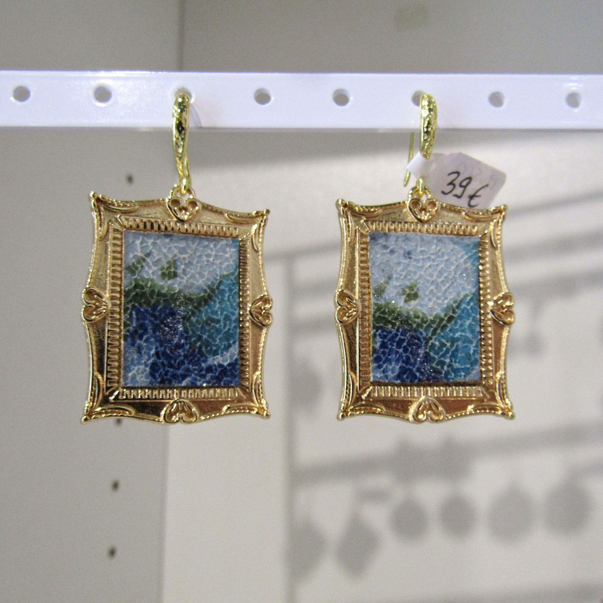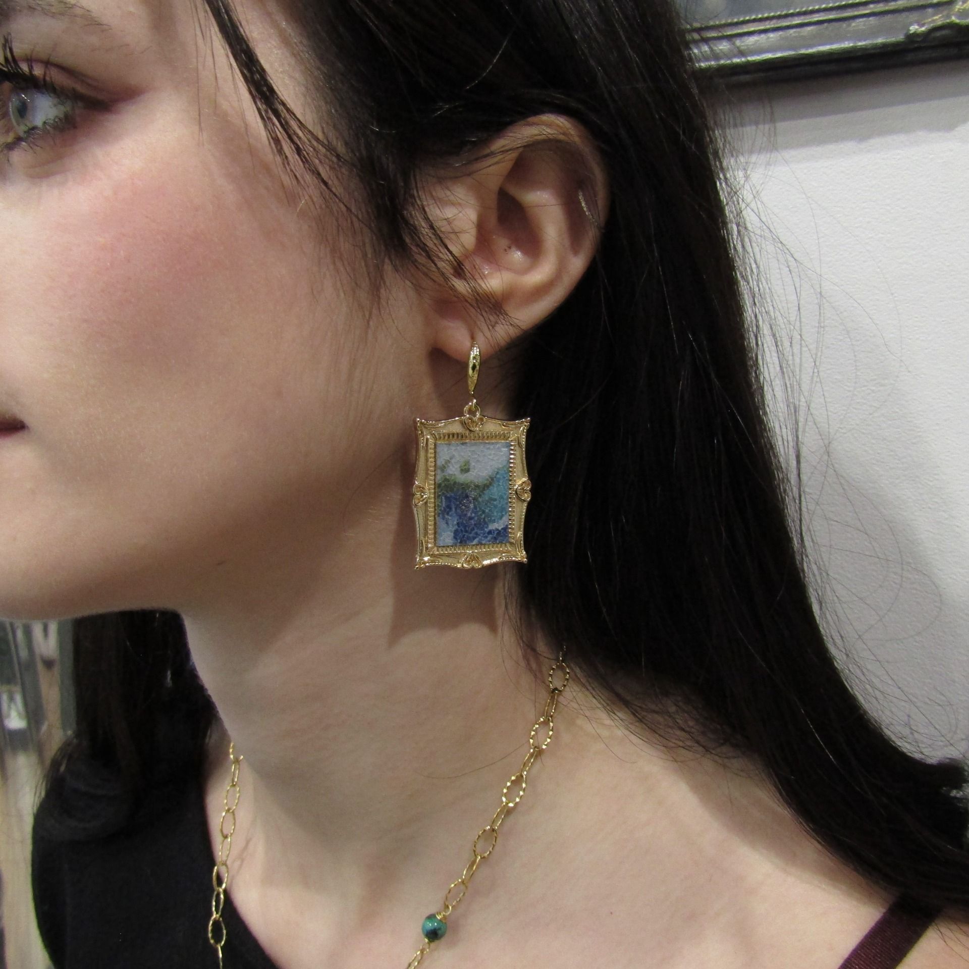 Porter un petit tableau de "Maître" aux oreilles pour avoir un look décalé et glamour. Petit cadre en laiton plaqué or 18k avec une jolie découpe d'un cuir fleuri bleu/vert à l'intérieur ; l'ensemble monté sur des jolis crochets d'oreilles ciselés.