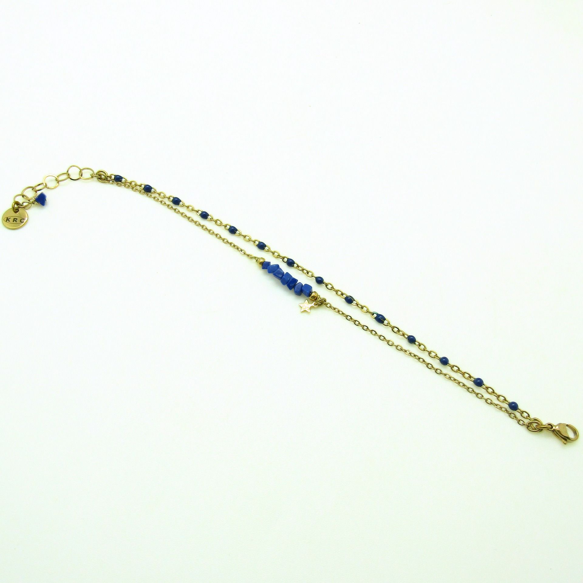 Deux chaînes fines en acier inoxydable plaqué or composent ce bracelet tout fin et lumineux parsemé d'éclats de Lapis Lazuli. L'autre chaîne a des petites gouttes émaillées bleues. Une mini étoile s'est accrochée aux petites perles de Lapis.