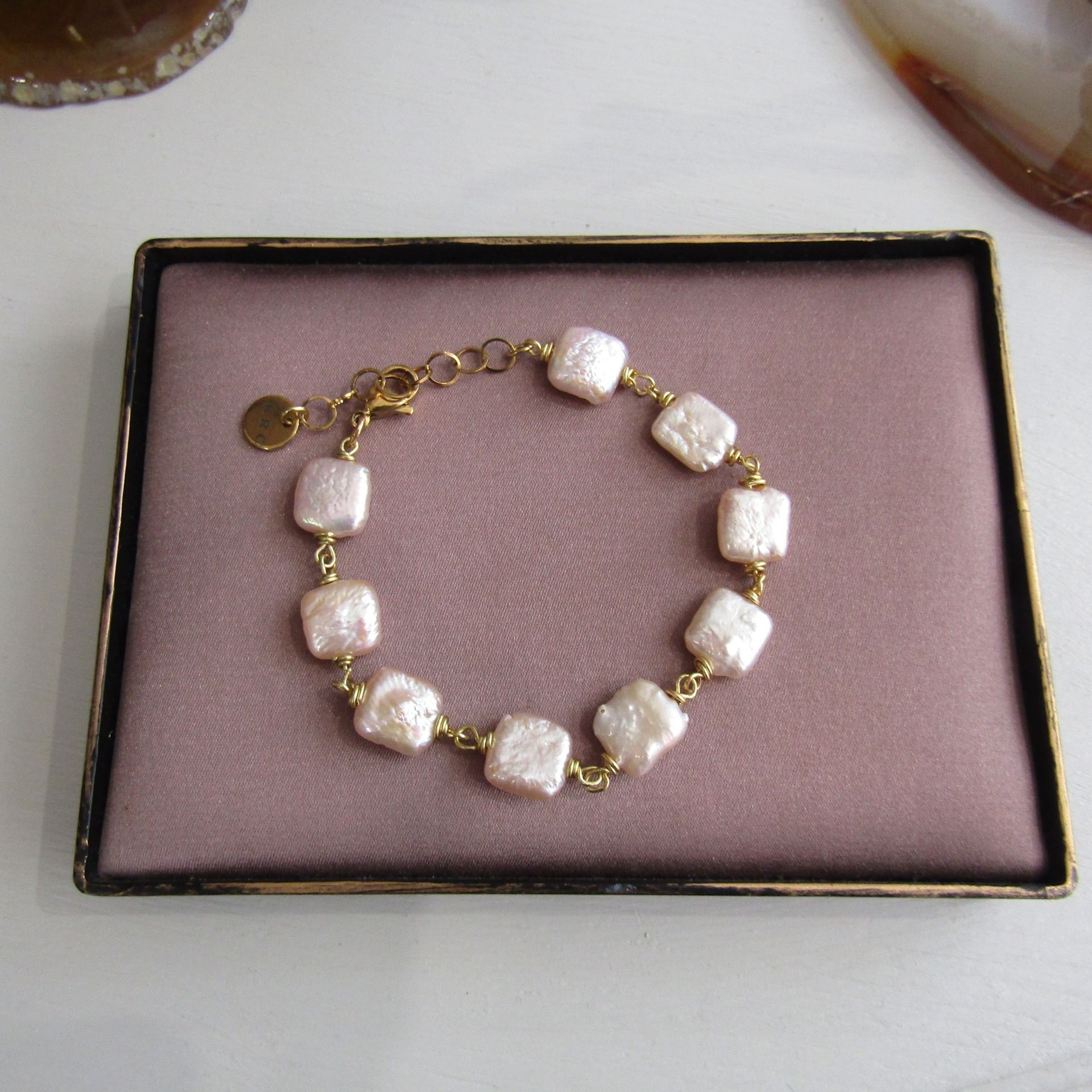 Des jolis petits carrés en perle d'eau douce blanc légèrement rosé (poudre) simplement dispersés autour de votre poignet. Un bracelet empreint de délicatesse que l'on peut mixer avec d'autres pour un bel effet.