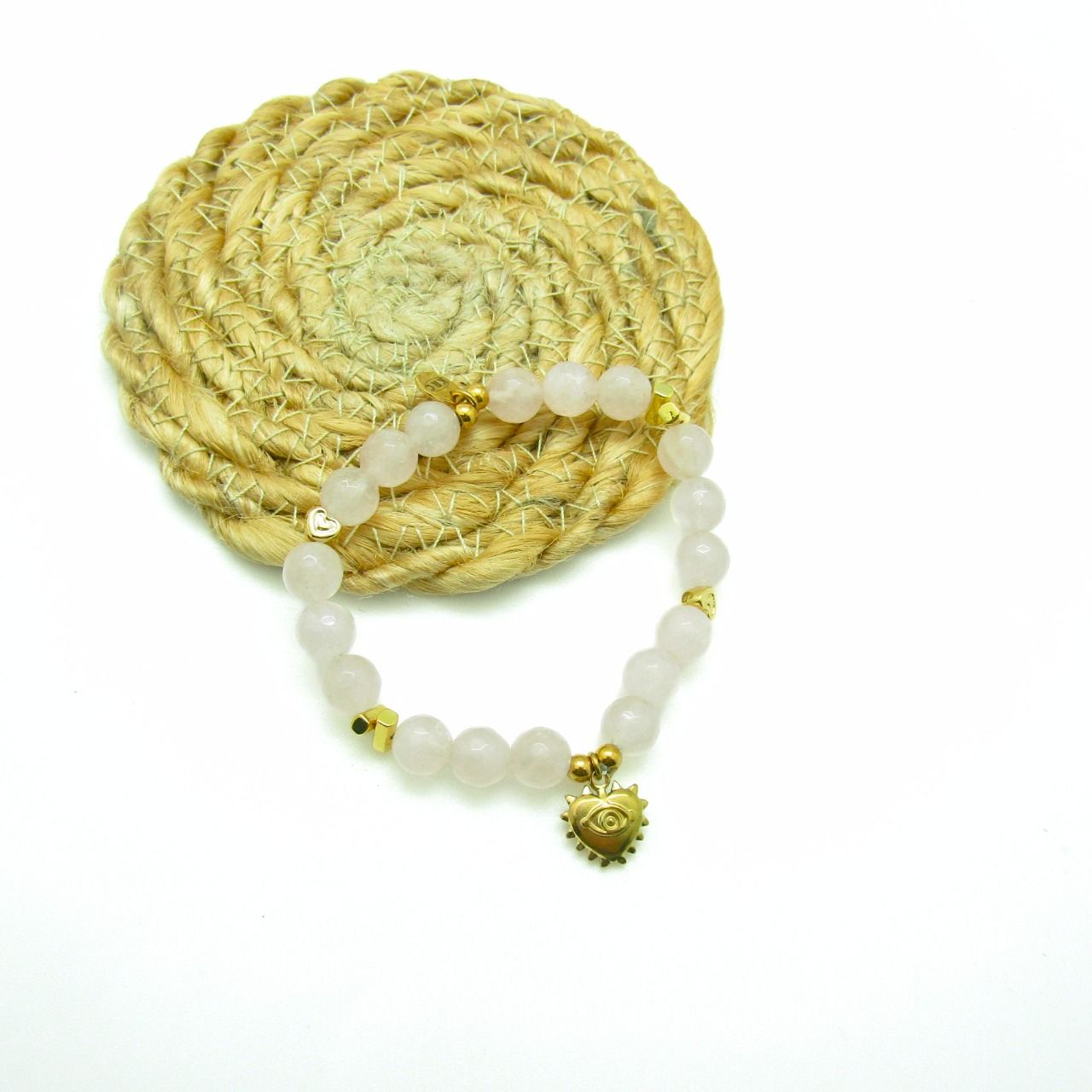 Quartz rose (perles de 8mm) et alternance de perles coeur et tonnelets, une breloque coeur/oeil pour ce joli bracelet que l'on peut mixer avec d'autres.