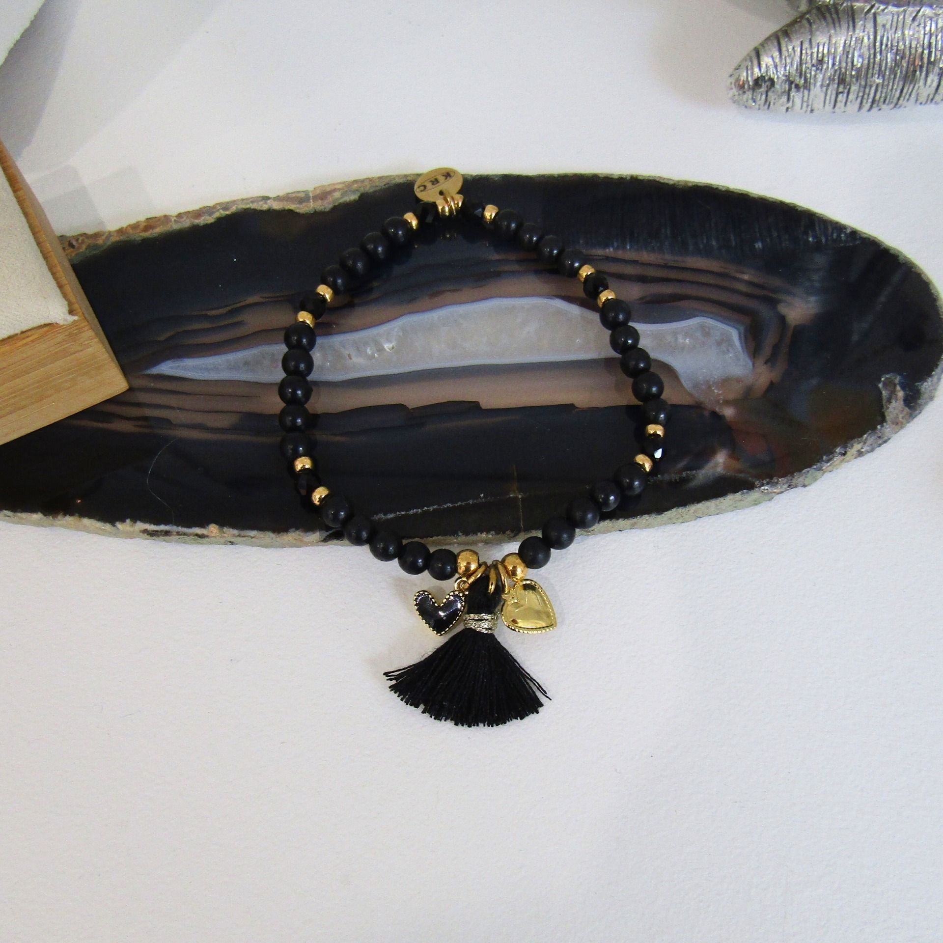 Fin bracelet élastique en perles de Shungite et Onyx agrémenté d'un pompon noir et deux deux petits coeurs plaqué or et émail noir. A mixer avec d'autres bracelets fin.