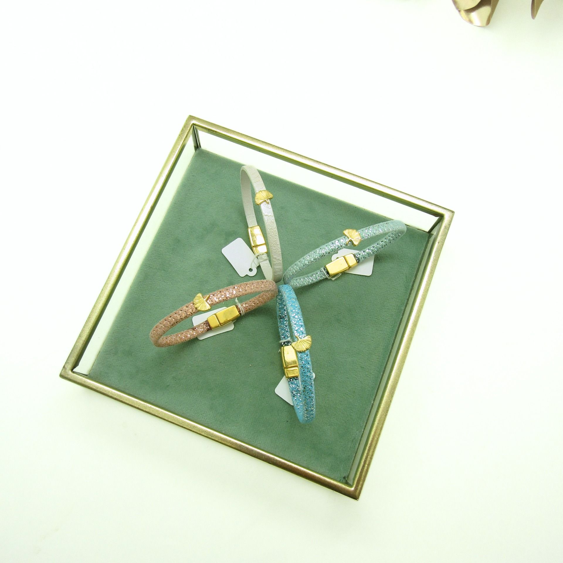 Une seule lanière de cuir (largeur 5mm) couleur grise moucheté argent et un petit passant feuille de ginko, pour ce bracelet tout simple à associer avec des bracelets chaîne par exemple. Fermoir aimanté zamack plaqué argent.