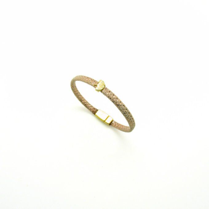 Une seule lanière de cuir (largeur 5mm) rose doré et un petit passant feuille de ginko, pour ce bracelet tout simple à associer avec des bracelets chaîne par exemple. Fermoir aimanté zamack plaqué or.