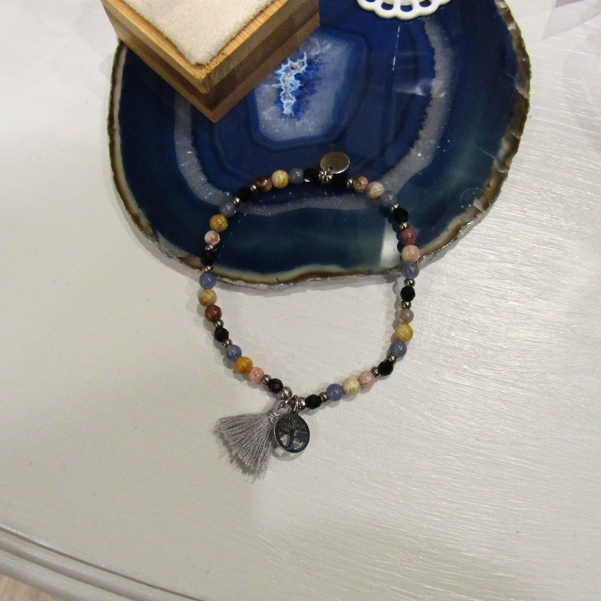 Aventurine bleue, Rhodonite, Corail fossile, Onyx et petites perles de verre gris métal composent ce joli bracelet élastique terminé par un petit arbre de vie en acier inoxydable et un pompon gris. Fin et coloré, ce bracelet s'associera à presque tout.