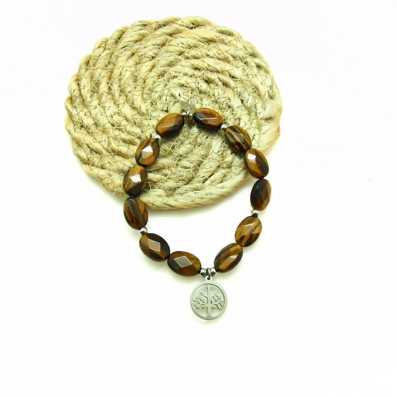 Bracelet élastique avec de jolies perles oeil de tigre ovales facettées et petite breloque arbre de vie en acier inoxydable.