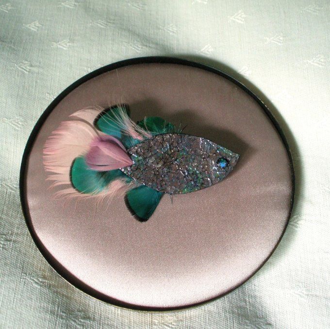 Poisson en cuir pailleté aux reflets violet, vert et or, plumes vertes et roses. oeil en strass cristal. So cute !