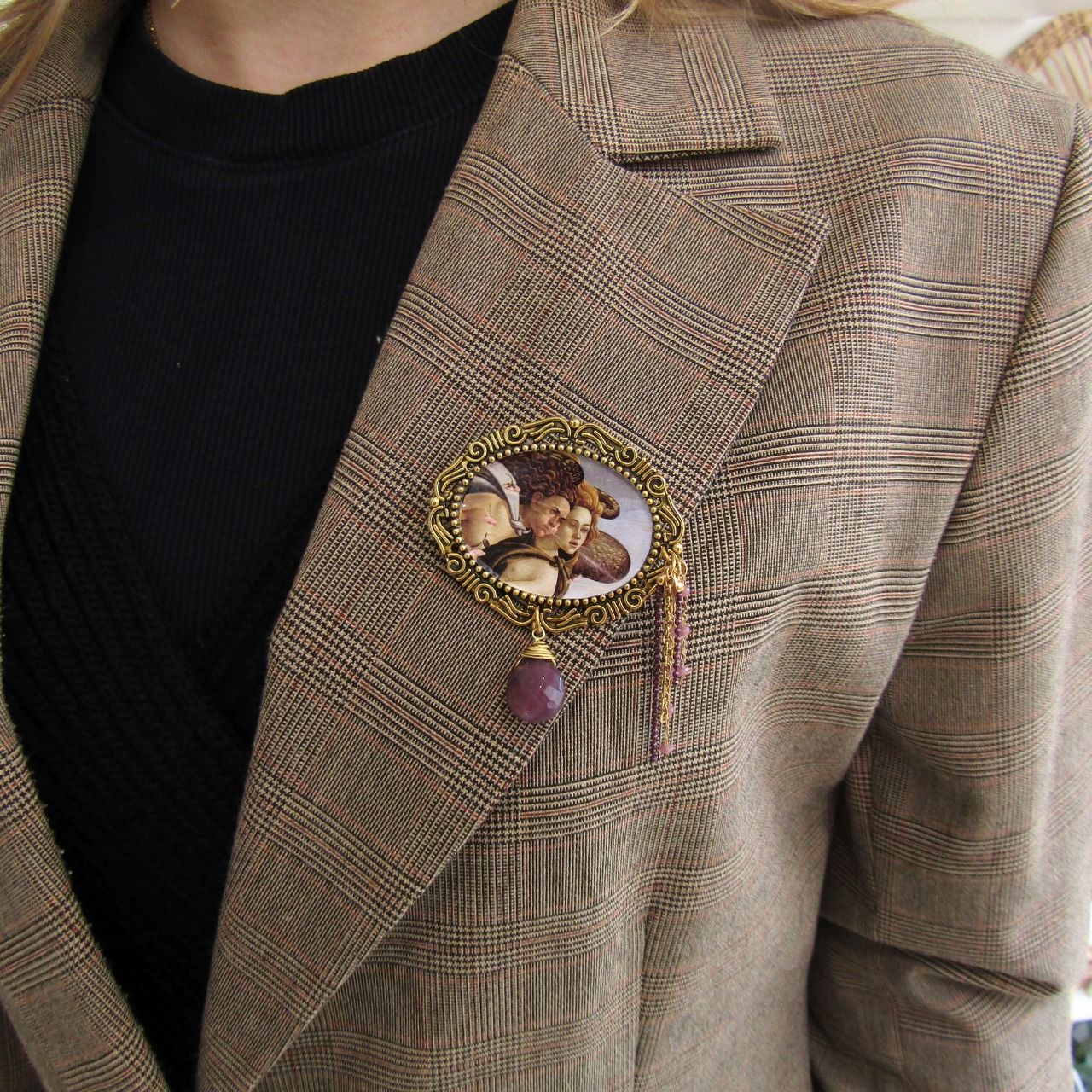 Broche ovale en laiton doré à l'ancienne, iconographie du tableau "la naissance de Vénus", le vent. Goutte pendante en cristal de Swarovski couleur prune et petites chaînes assorties qui ornent le côté.