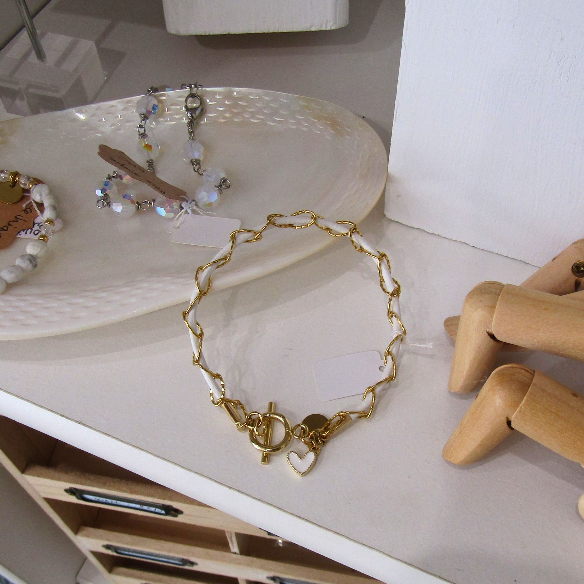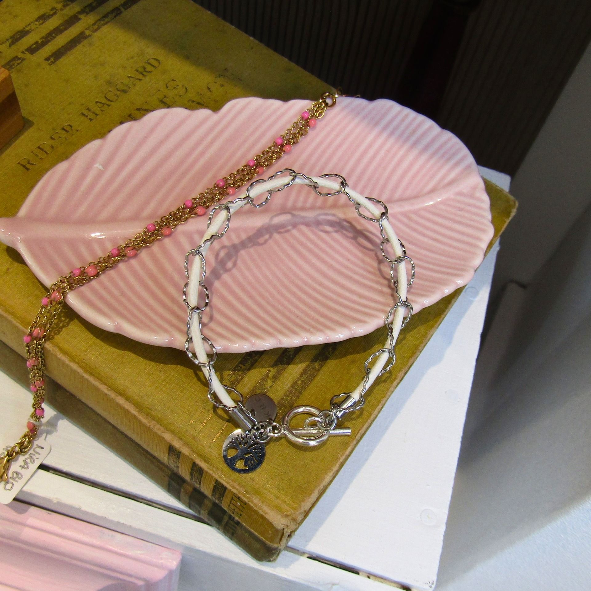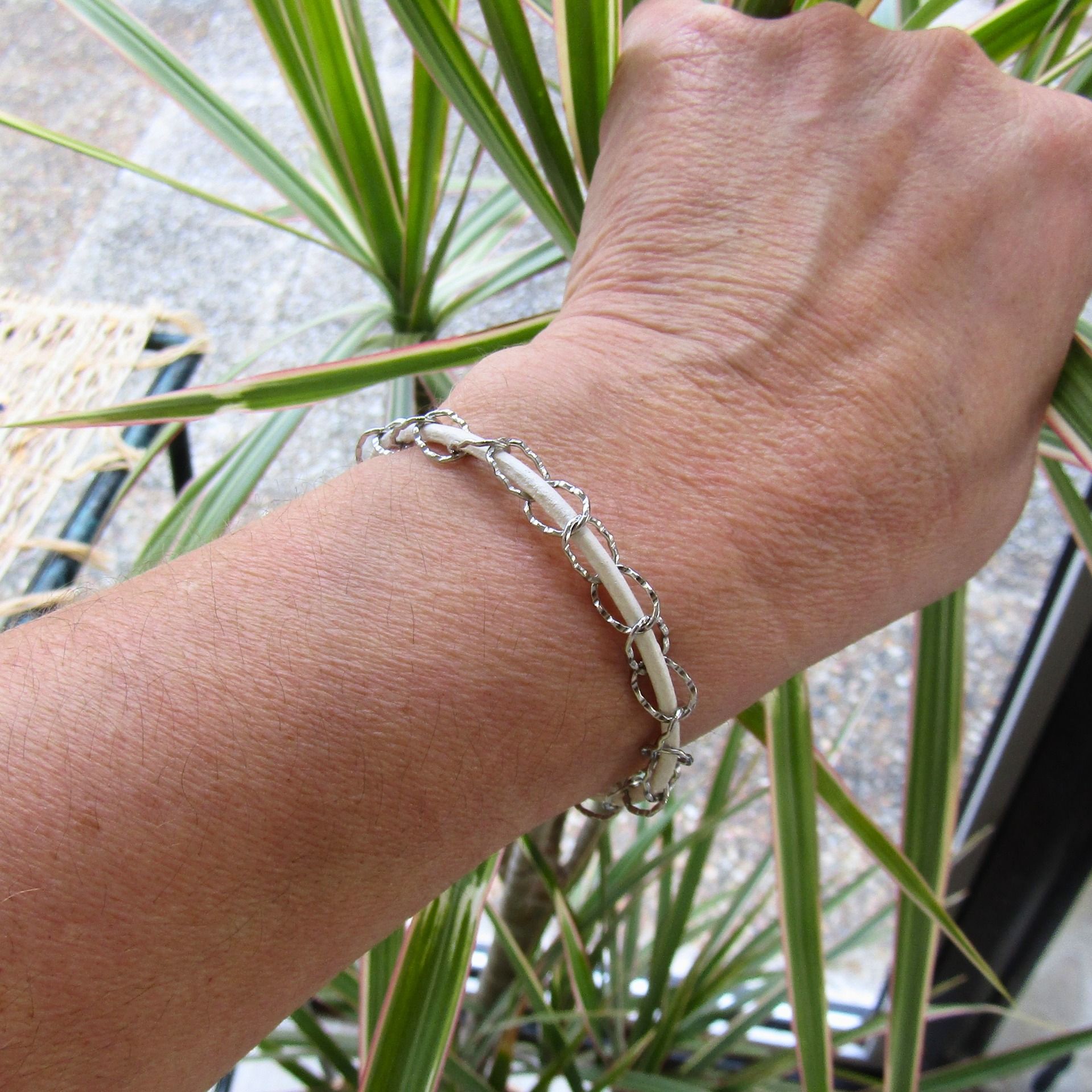 Cuir blanc et chaîne maille ovale ciselée acier inoxydable. Fermoir T et petite breloque arbre de vie sur la version acier et petit coeur émaillé blanc sur le modèle plaqué or.