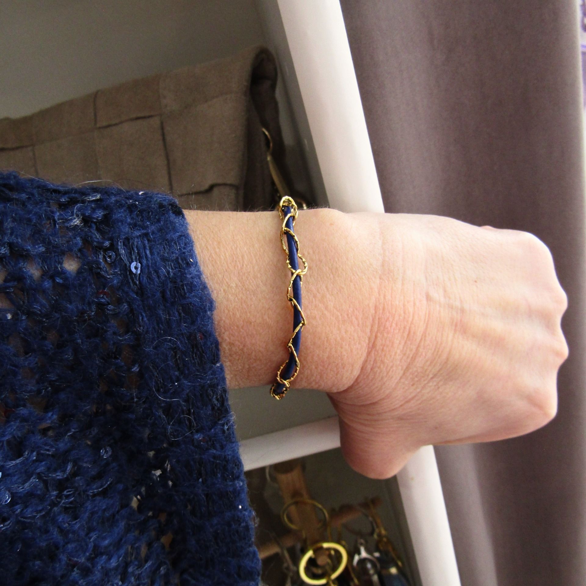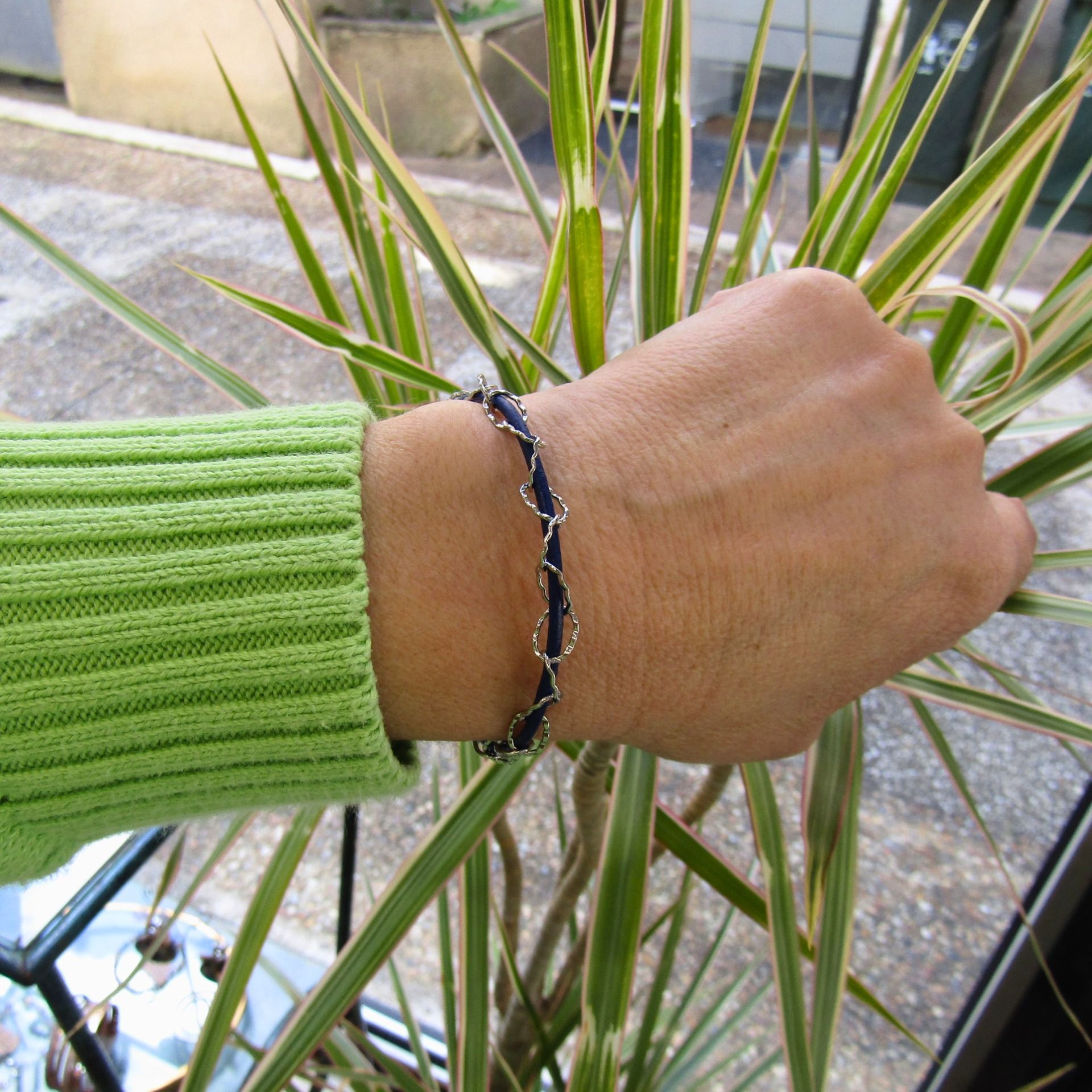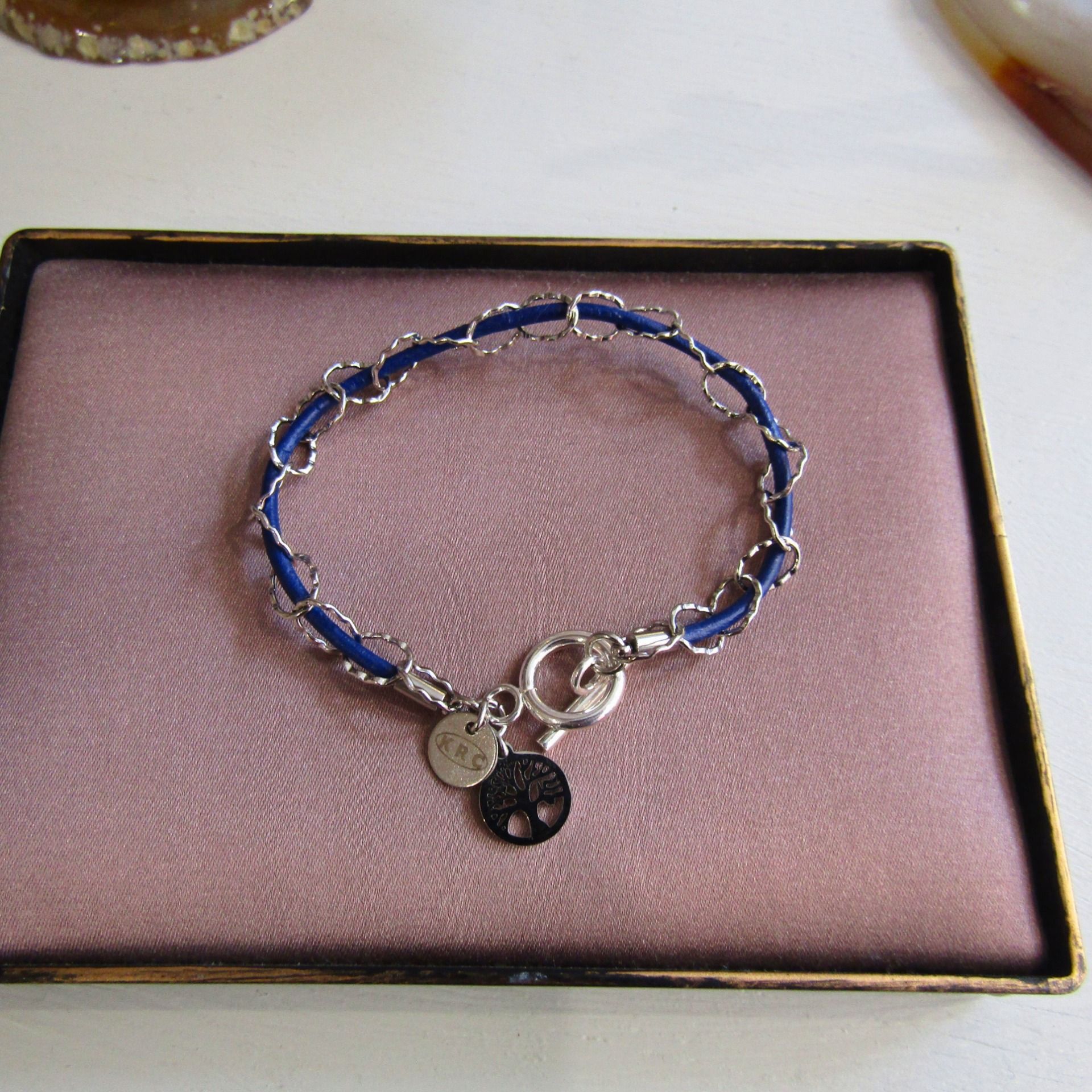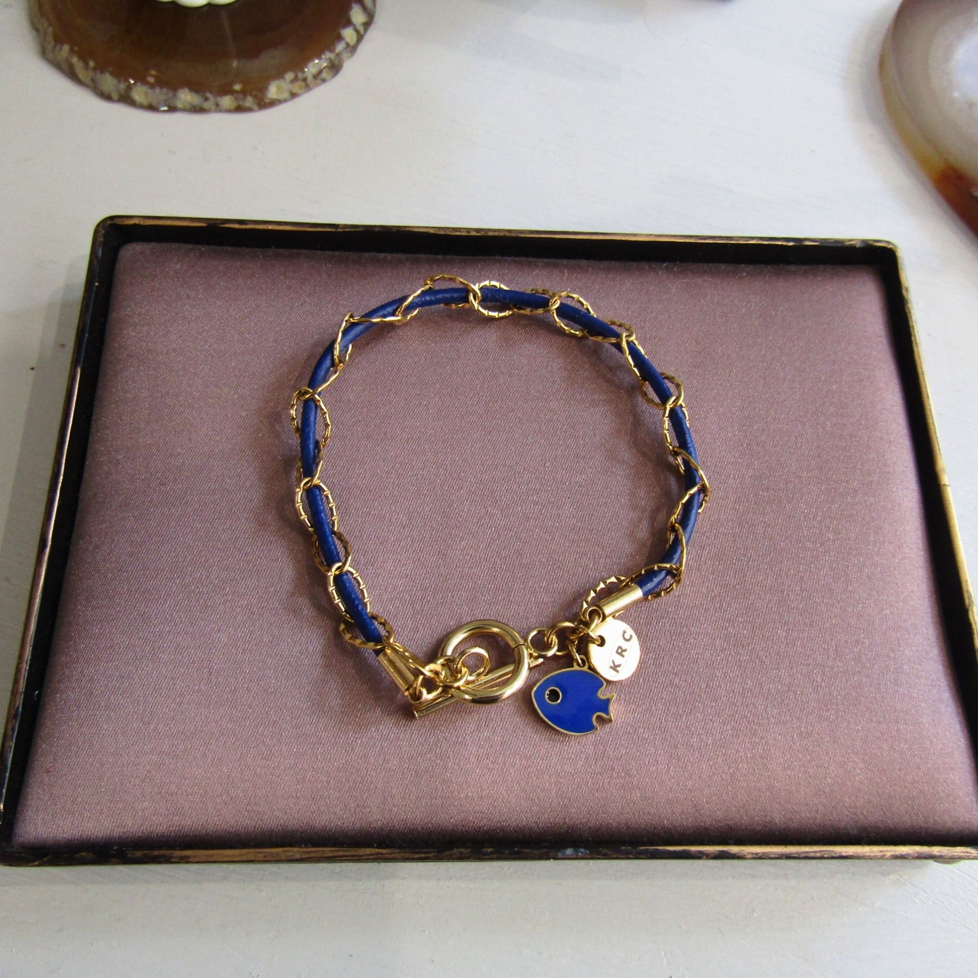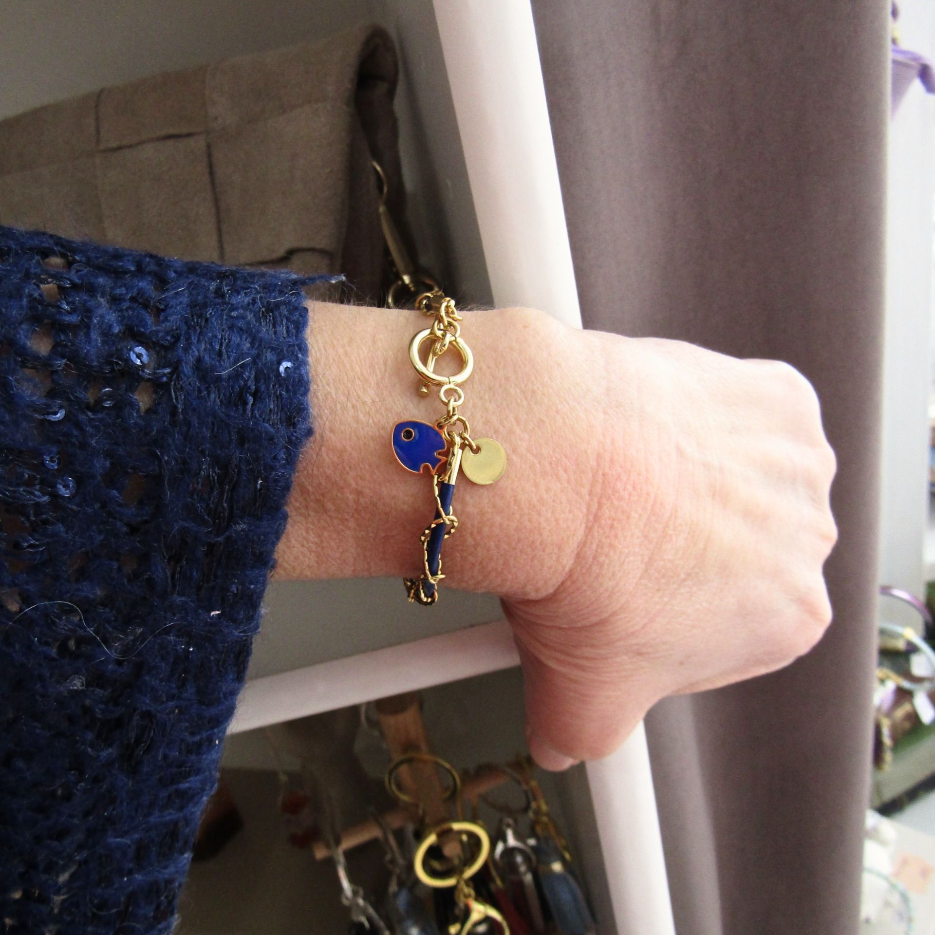 Cuir bleu dur et chaîne maille ovale ciselée acier inoxydable. Fermoir T et petite breloque arbre de vie sur la version acier et petit poisson émaillé bleu sur le modèle plaqué or.