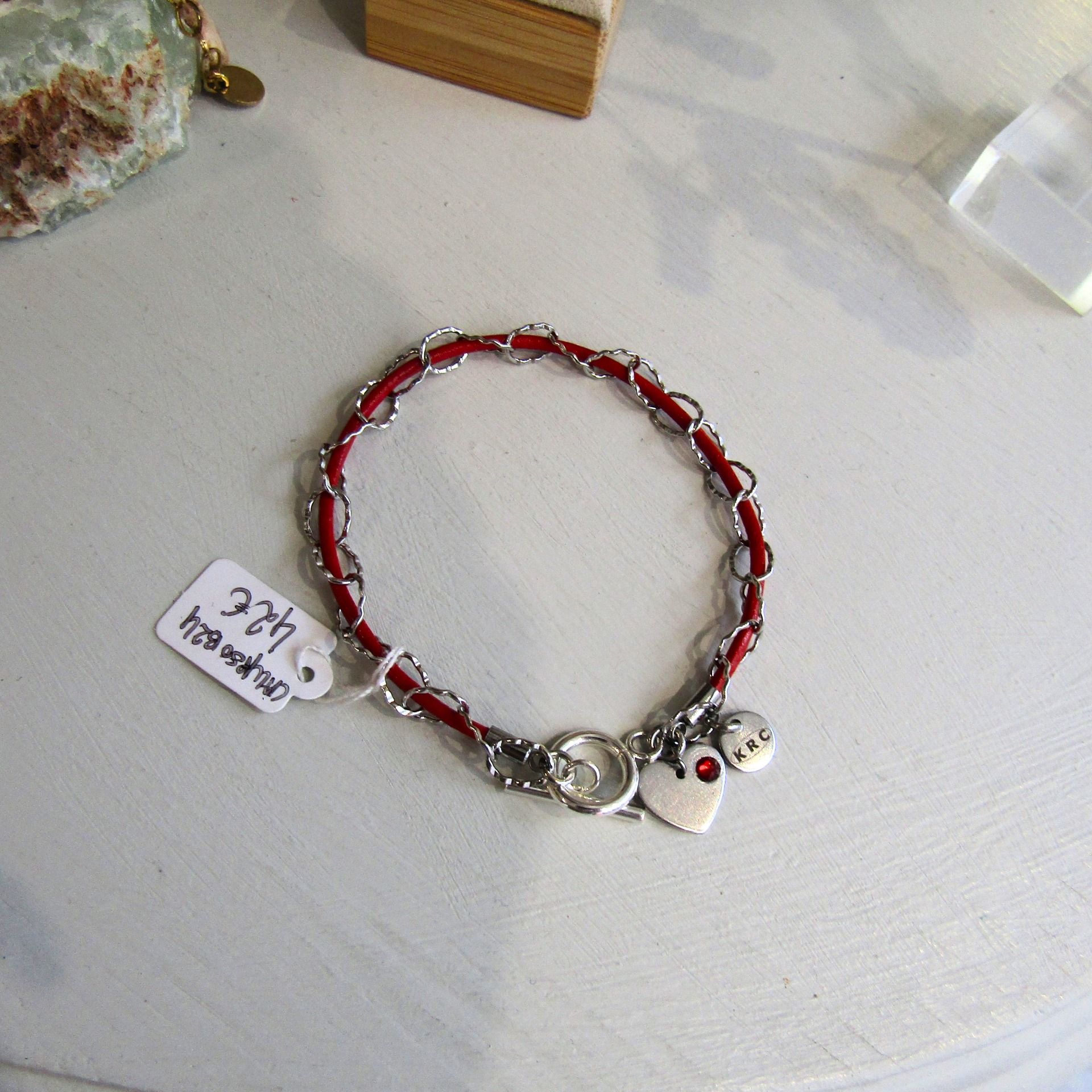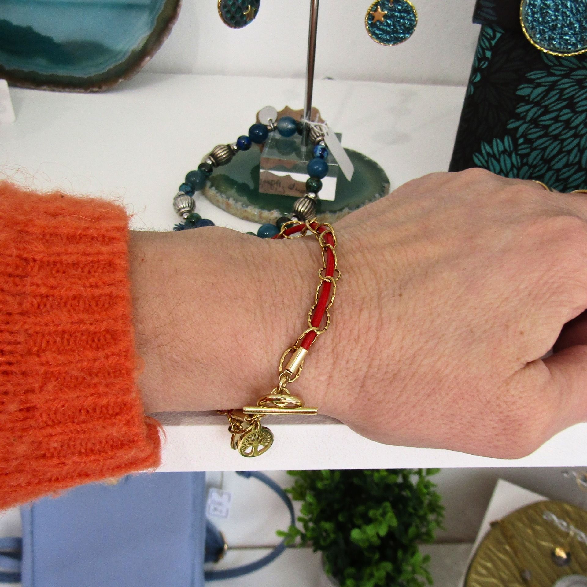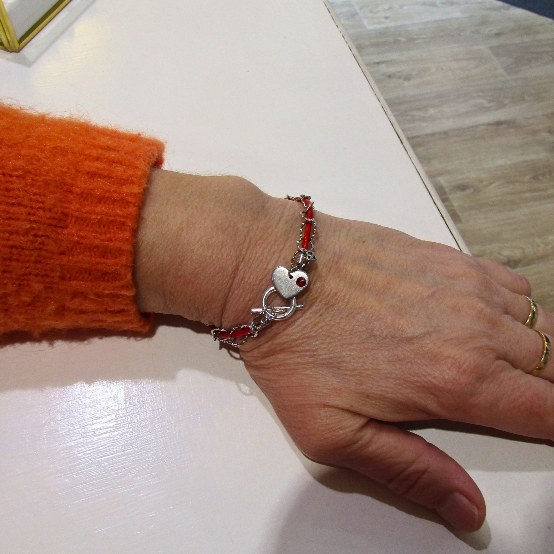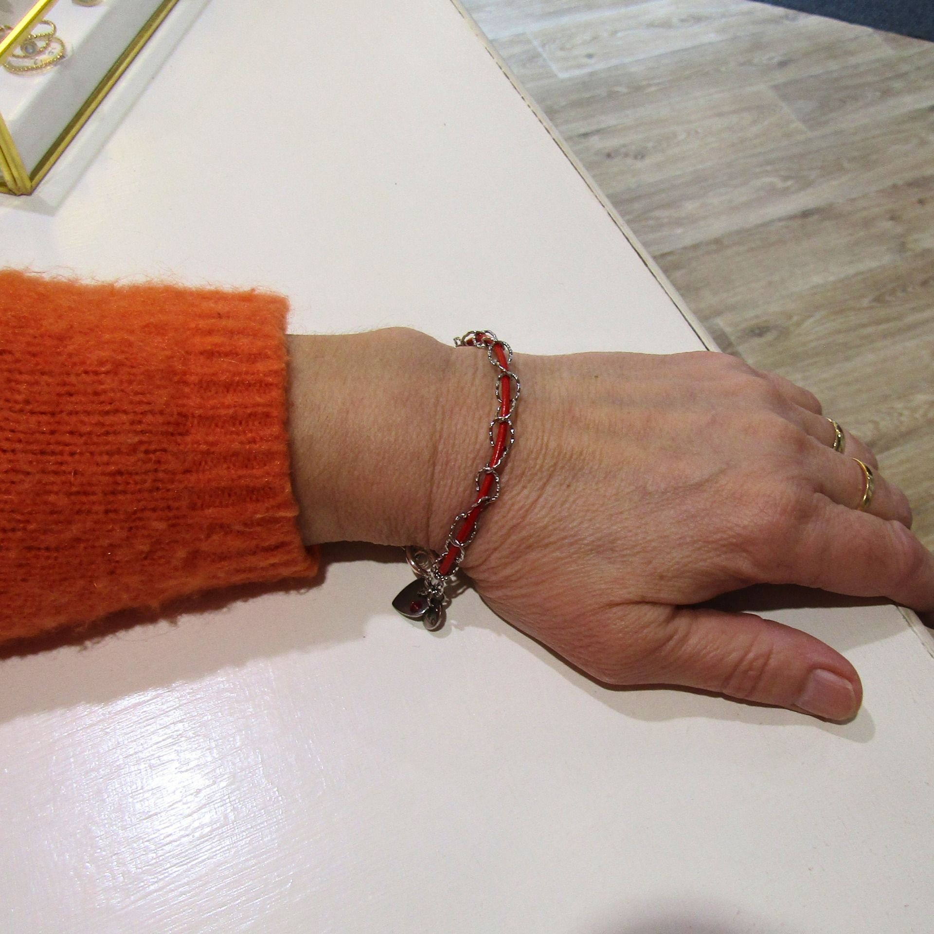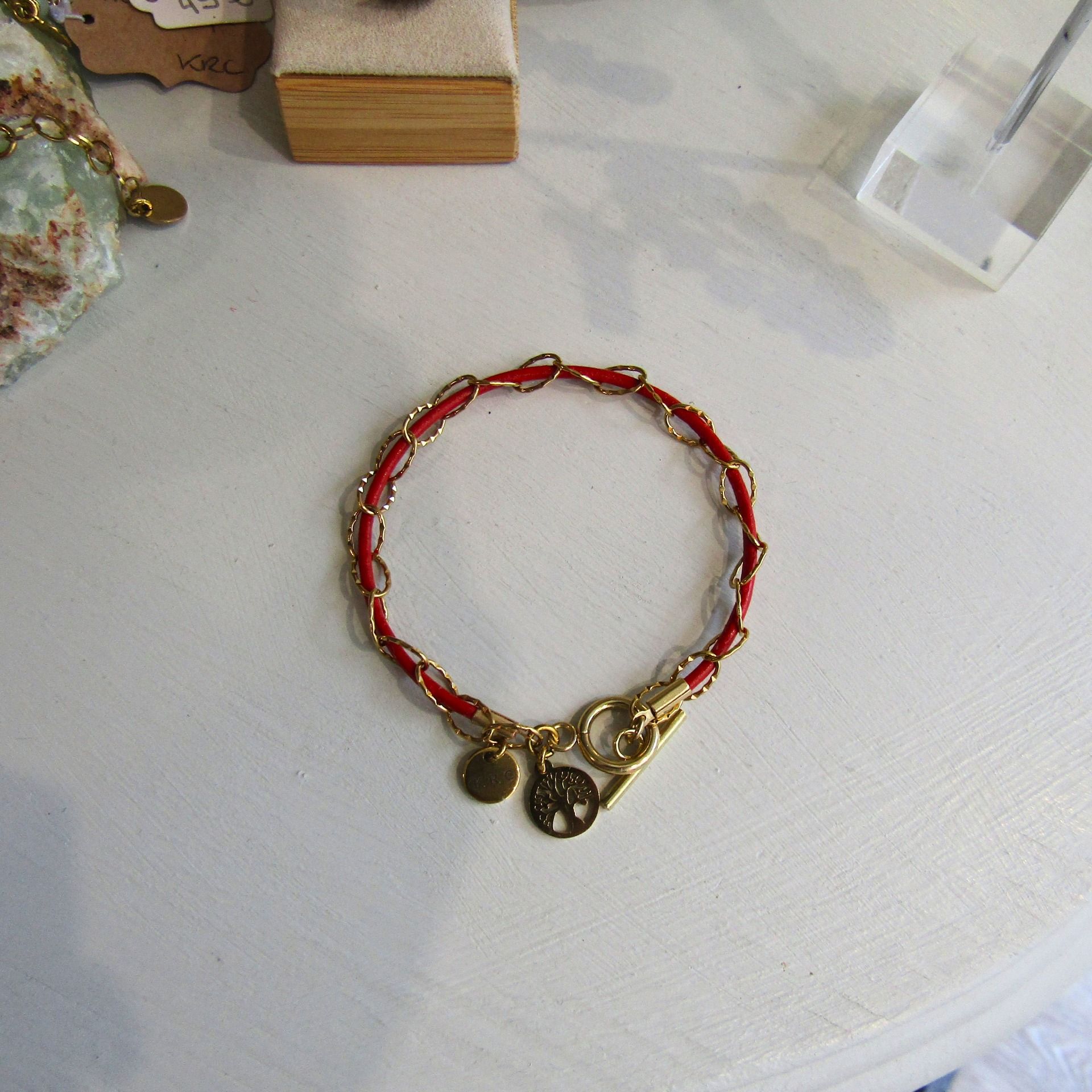 Cuir rouge et chaîne maille ovale ciselée acier inoxydable. Fermoir T et petite breloque arbre de vie sur la version dorée et coeur strassé sur le modèle acier.