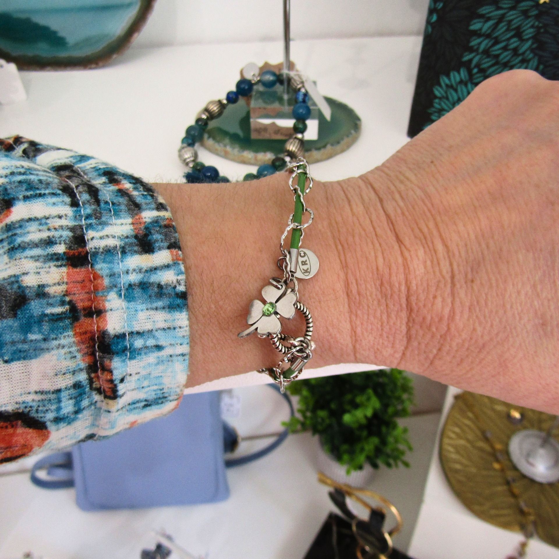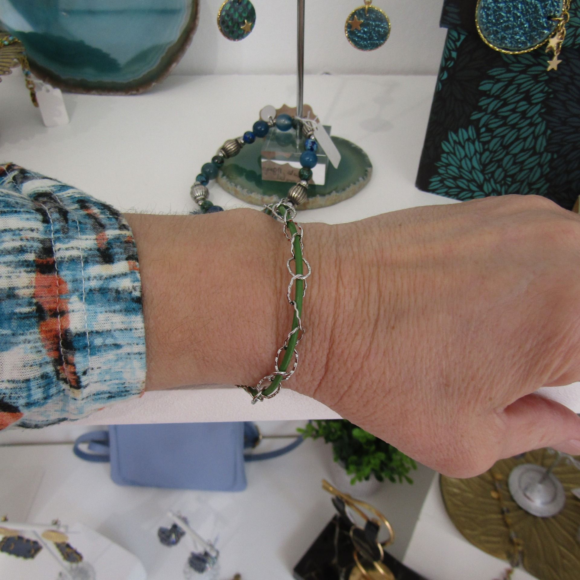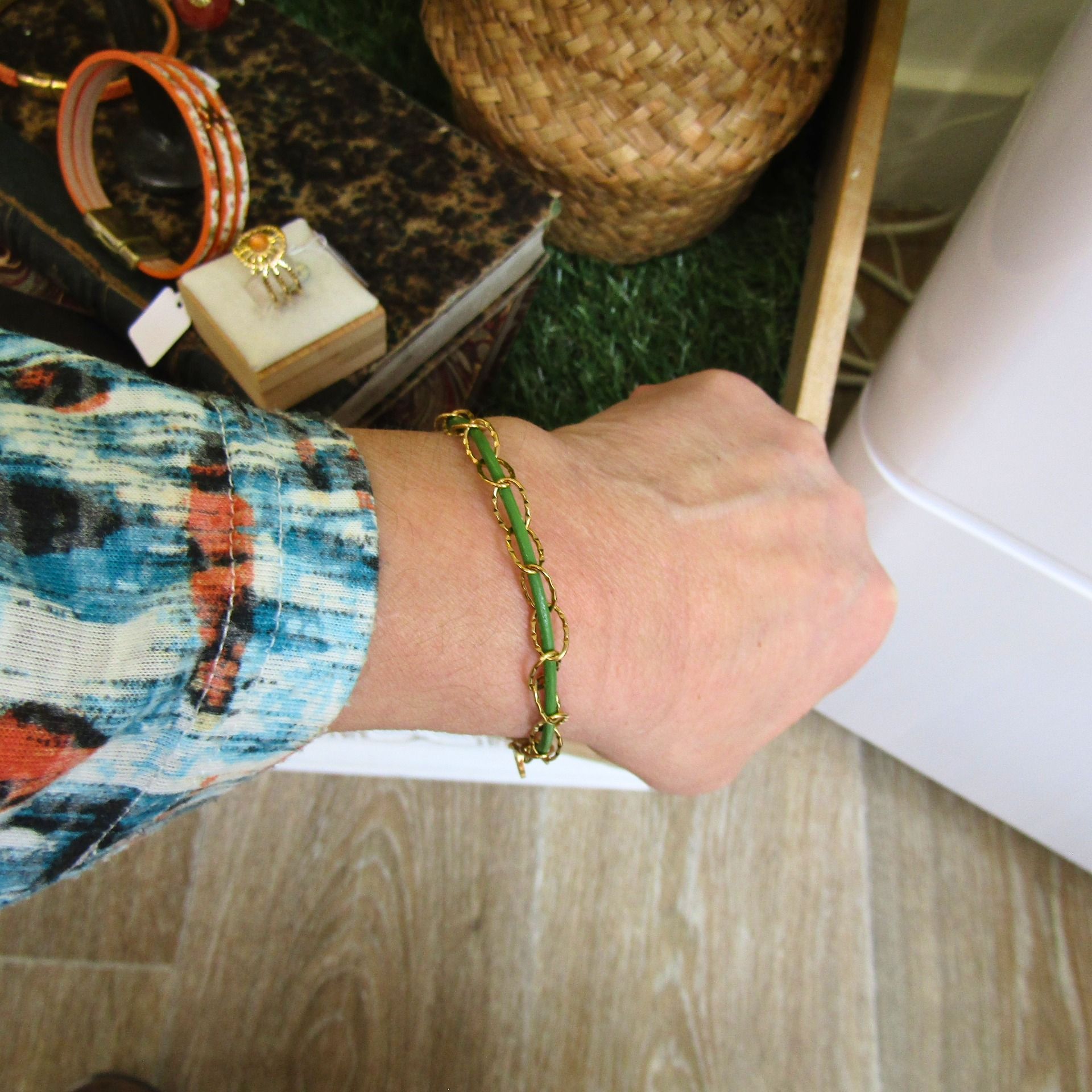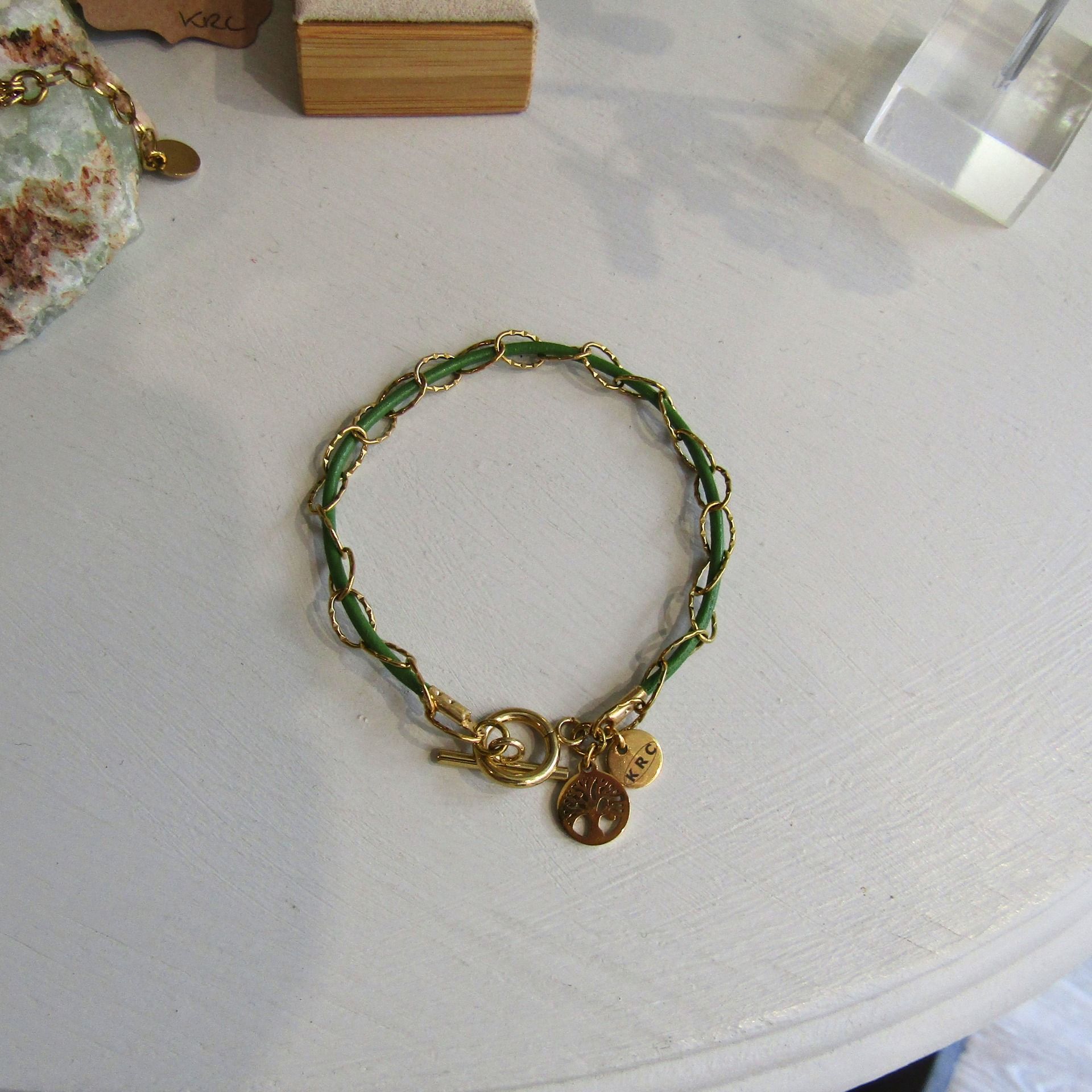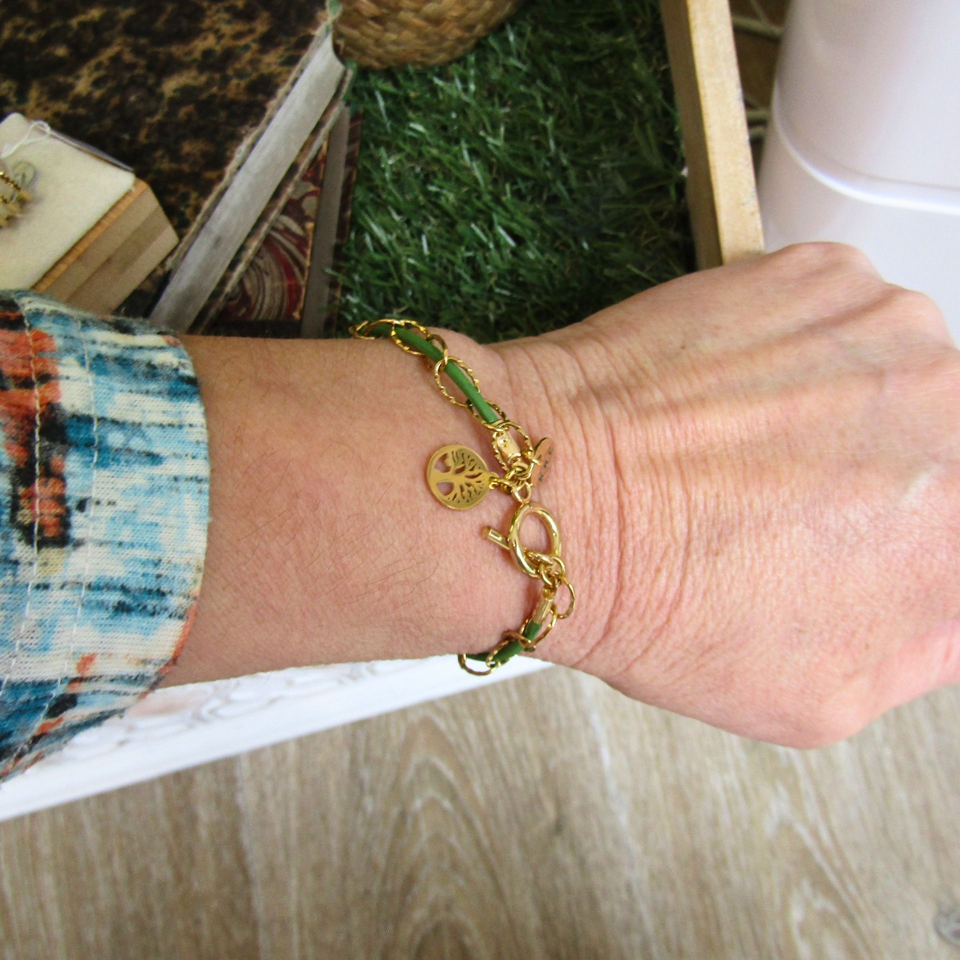 Cuir vert gazon et chaîne maille ovale ciselée acier inoxydable. Fermoir T et petite breloque arbre de vie sur le bracelet doré et breloque trèfle sur la version acier.