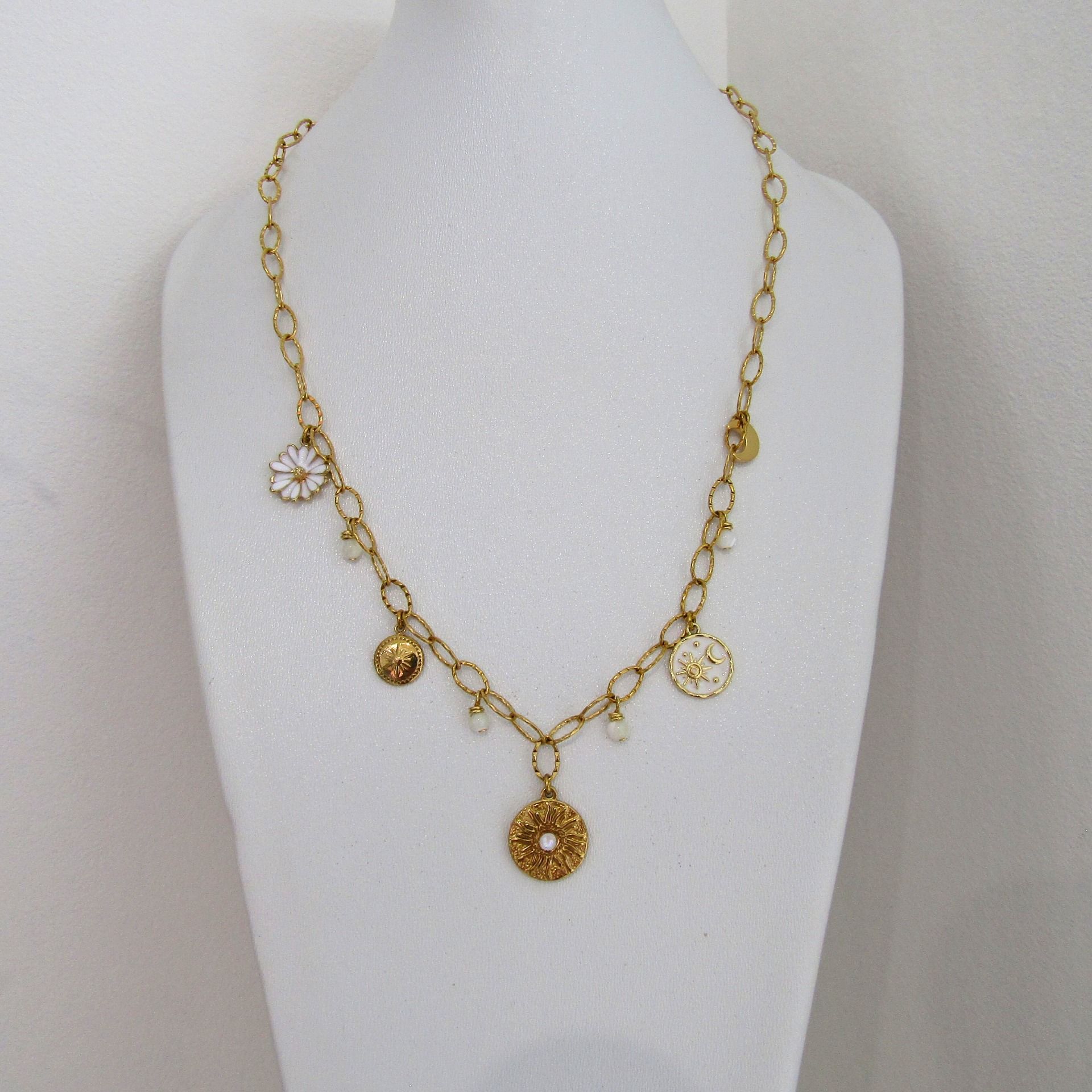 Cette chaîne aux maillons ovales ciselés est empreinte de spiritualité avec ses breloques soleil, lune et fleur, agrémentée de perles d'eau douce différentes. Pour un look actuel on le porte avec d'autres chaînes plus fines ou encore avec un fin sautoir