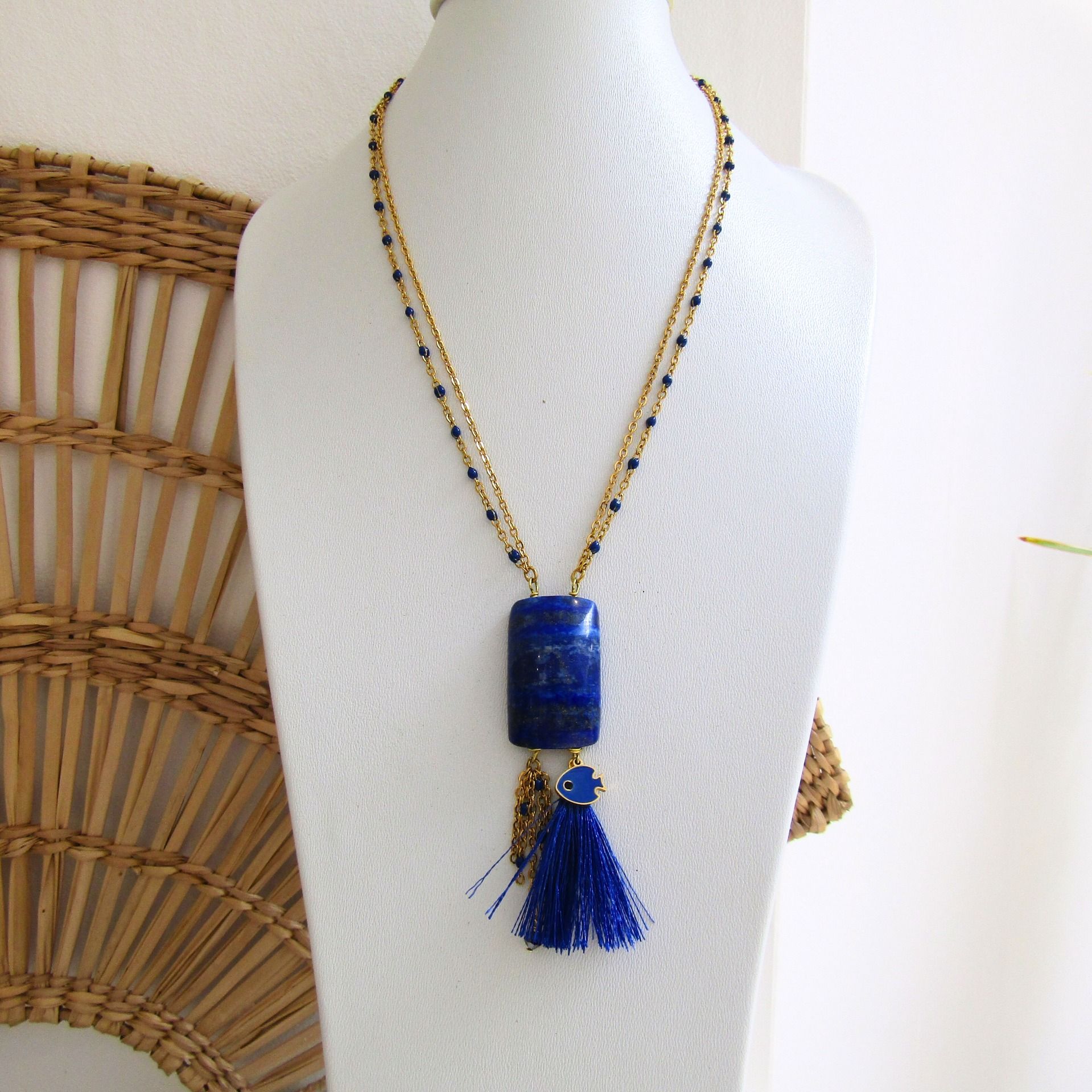 Une belle pierre de Lapis Lazuli, pompon, chaînes et poisson émaillé, donnent toute l'originalité à ce collier. Arborez fièrement cette pierre lumineuse aux multiples bienfaits sur votre esprit ; on vous remarquera !