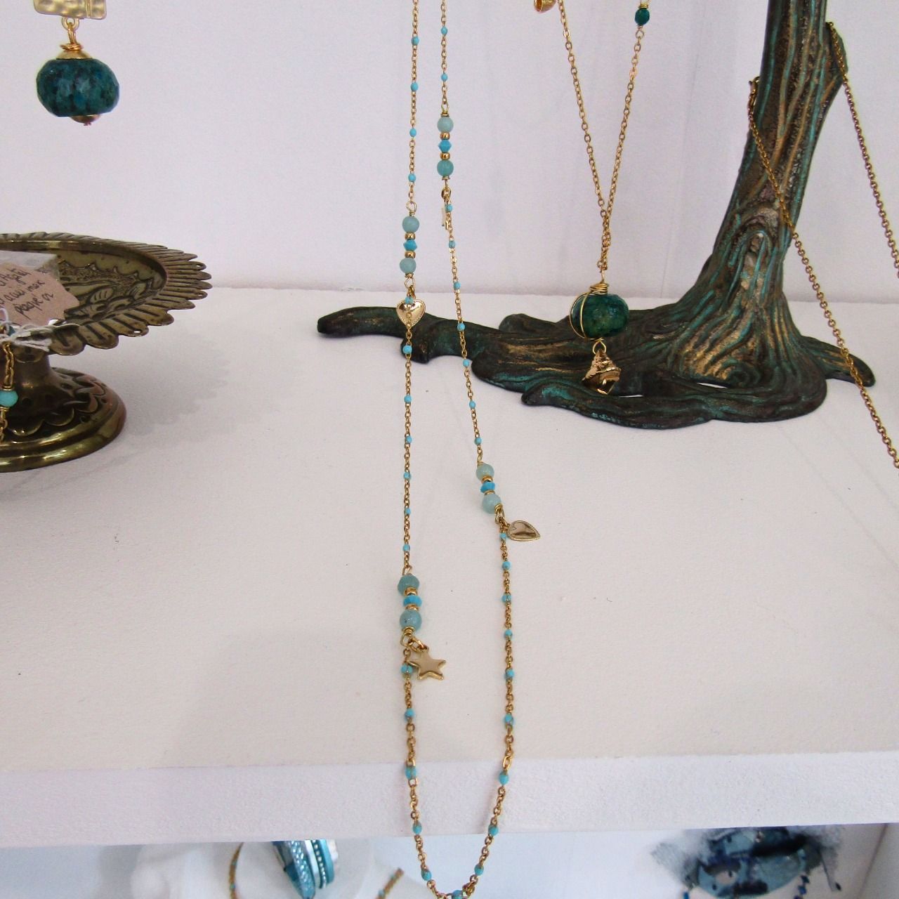 Un joli sautoir tout fin avec perles d'Amazonite et cristal, à porter en superposition avec d'autres chaines ou colliers. Deux petites étoiles et deux coeurs sont suspendus à la fine chaîne acier inoxydable plaqué or parsemée de petites bleu ciel.