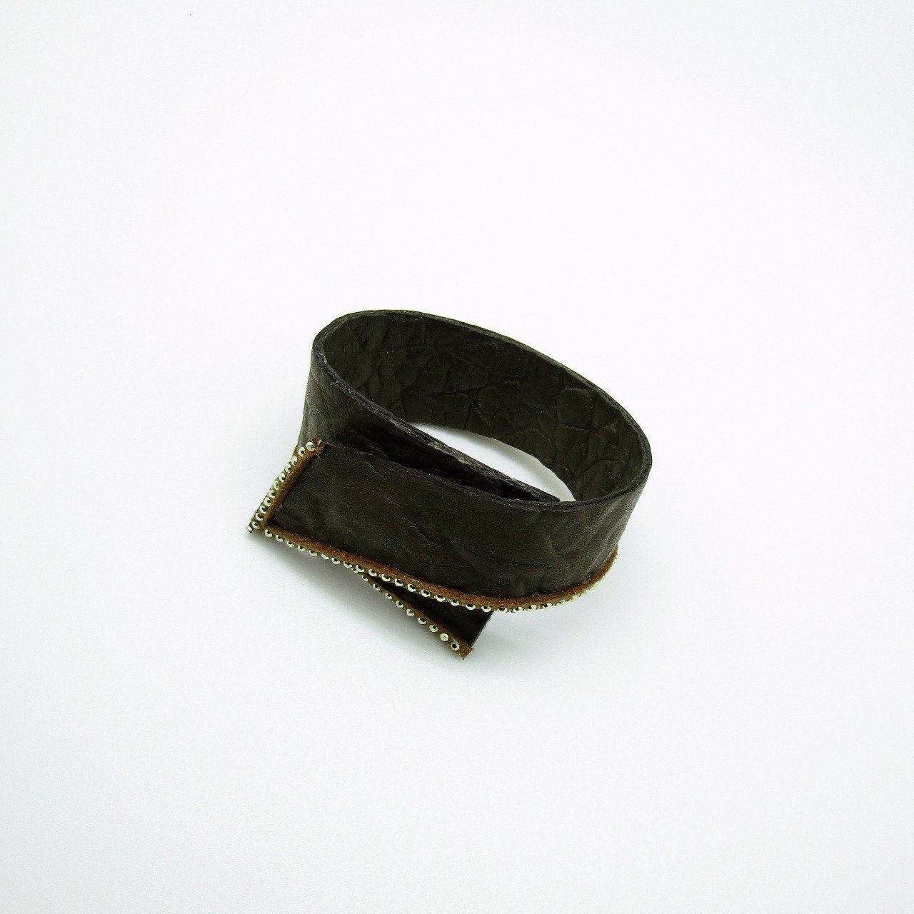 Manchette cuir brun gaufré avec suédine marron à petits clous dorés cousus sur le dessus. Le fermoir aimanté est invisible, je l'ai intégré entre les deux cuirs qui composent le bracelet, trop pratique !