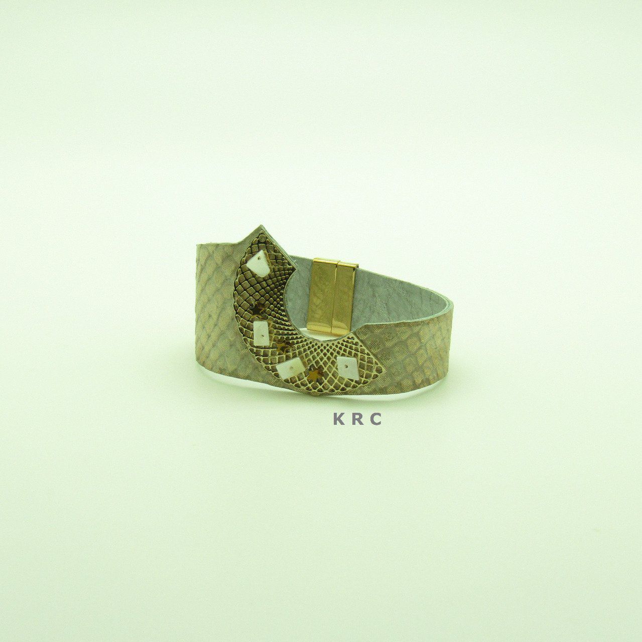 Bracelet cuir "serpent" beige irisé composé d'un motif demi-cercle ajouré plaqué or sur lequel sont cousus éclats de nacre et étoiles en hématite dorée. Entièrement doublé cuir gris clair. Fermoir aimanté en acier doré. Long 18.5 cm (taille M).