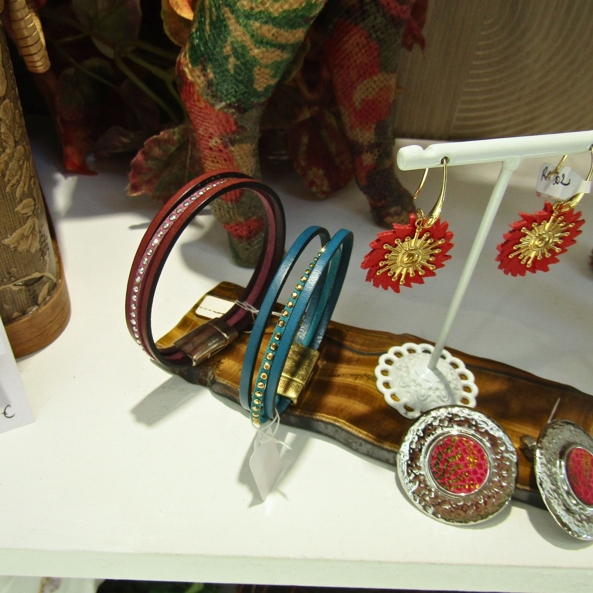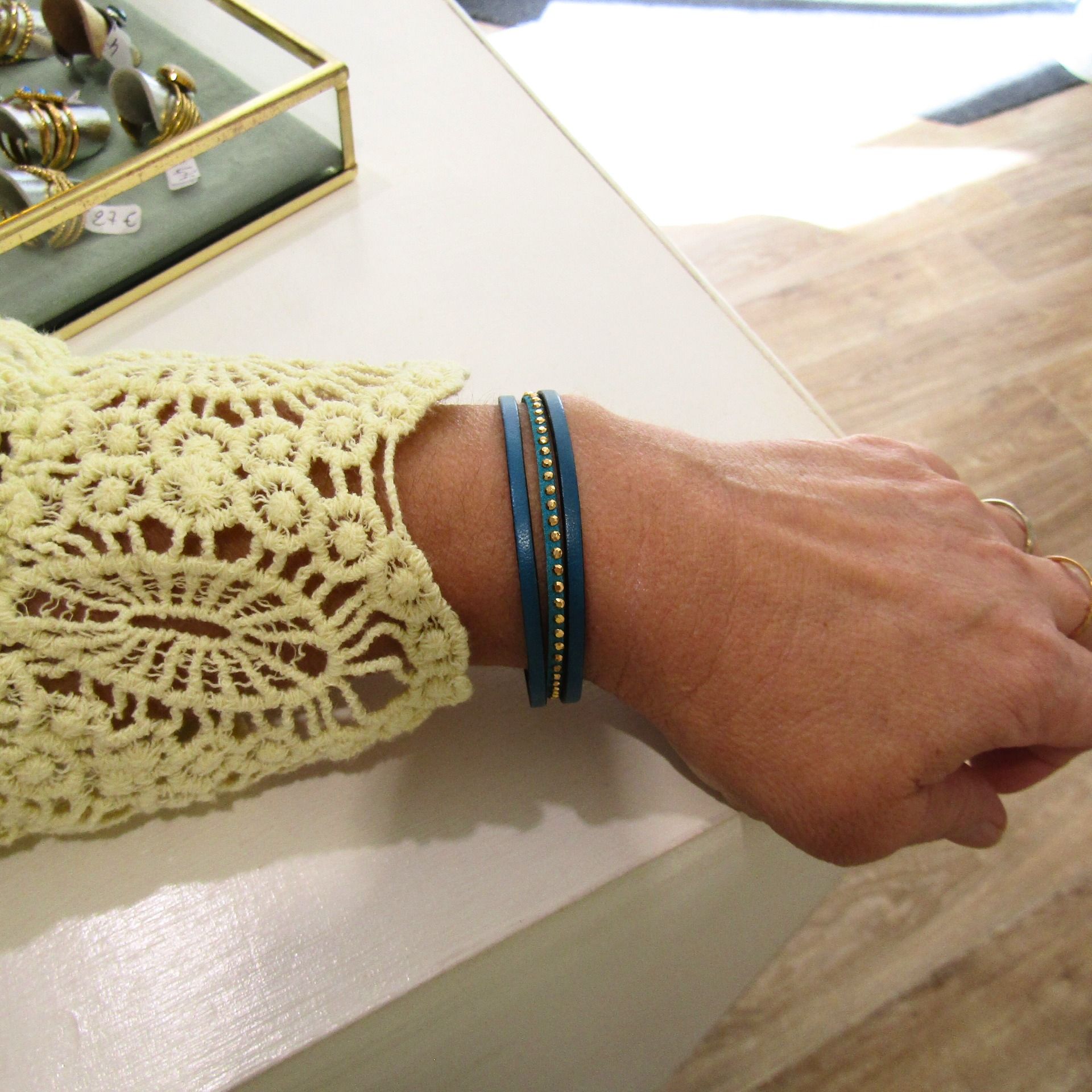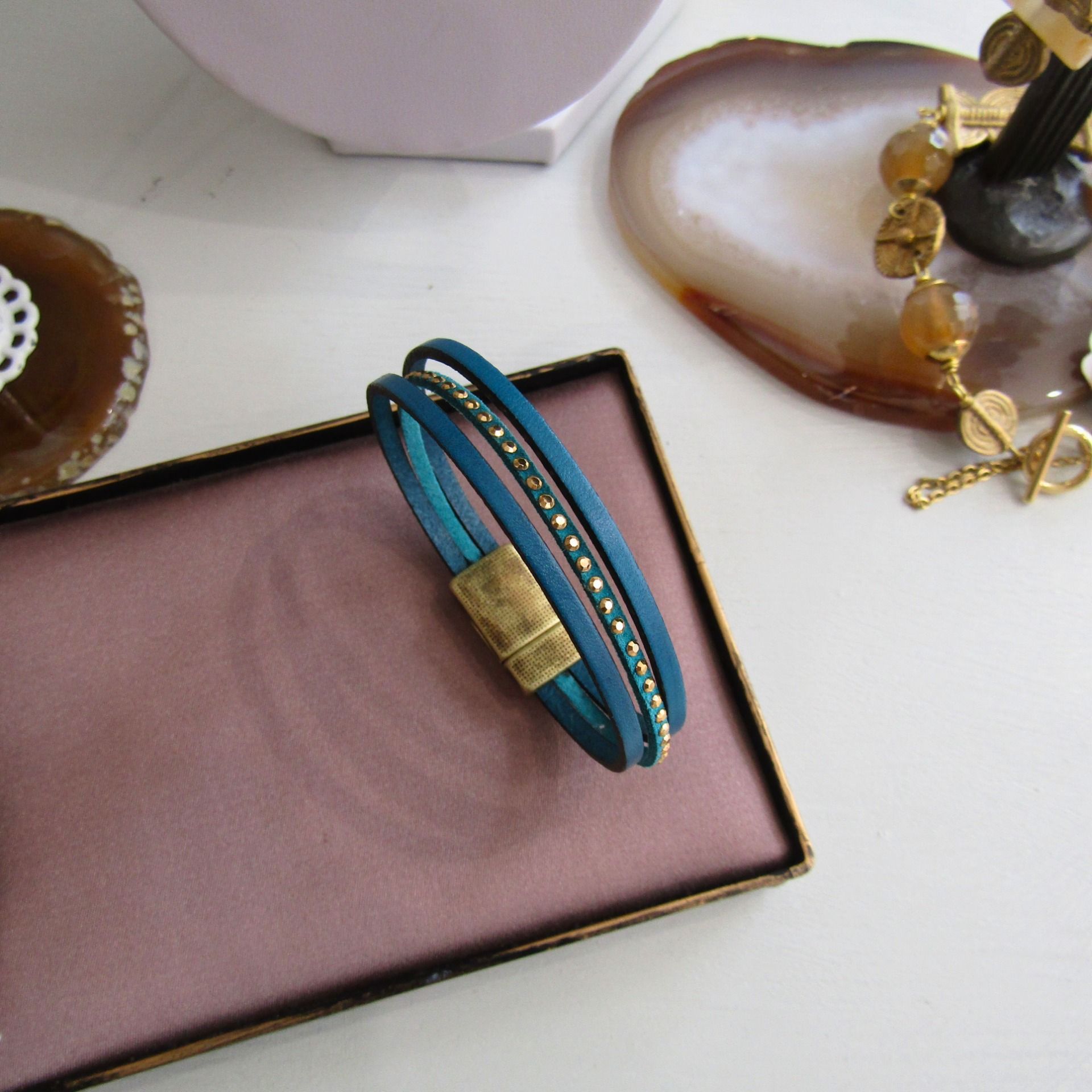 Bracelet cuir largeur 10mm avec deux lanières de cuir bleu canard, bleu pétrole et la suédine bleu vert clous dorés au centre. Fermoir aimanté en zamack bronze. Longueur taille M :18 cm fermé.