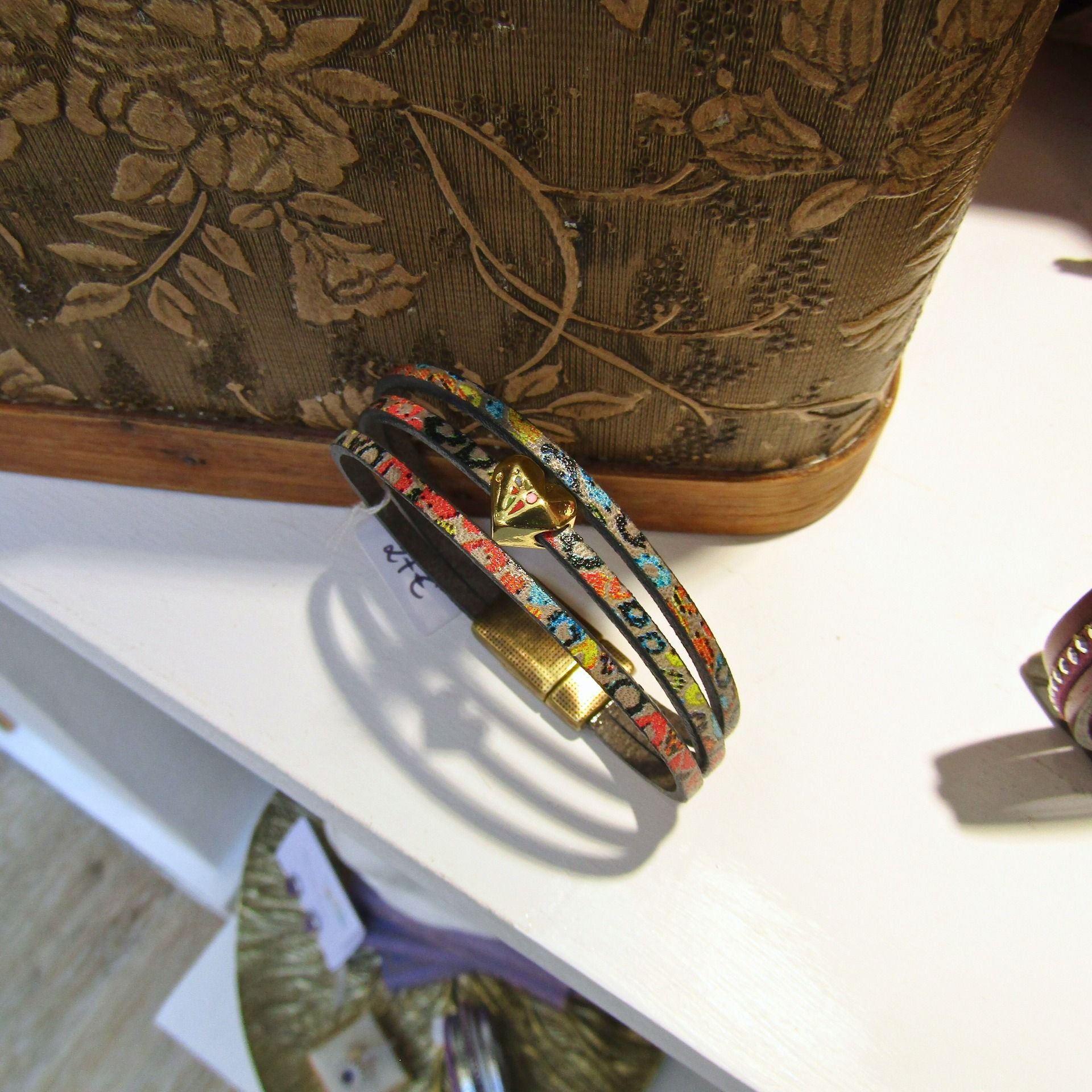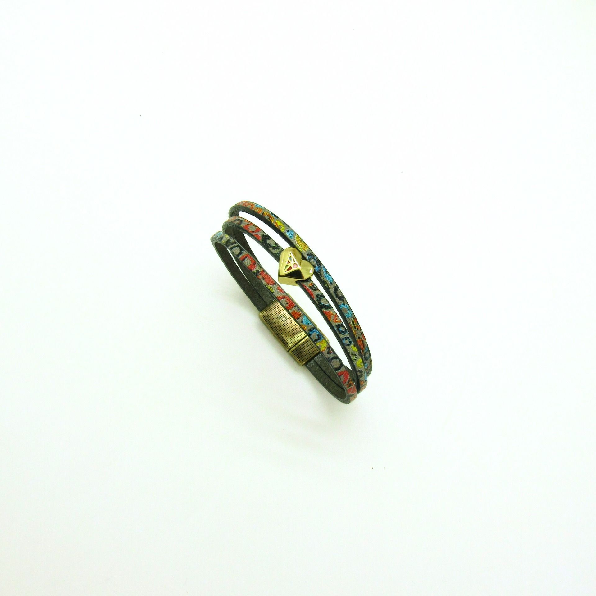 Bracelet cuir largeur 10mm avec trois lanières de cuir imprimé de motifs inspiration indienne "Pushkar" avec un joli passant coeur en plaqué or avec des petits motifs couleur en émail sur le dessus. Fermoir aimanté en zamack bronze.
