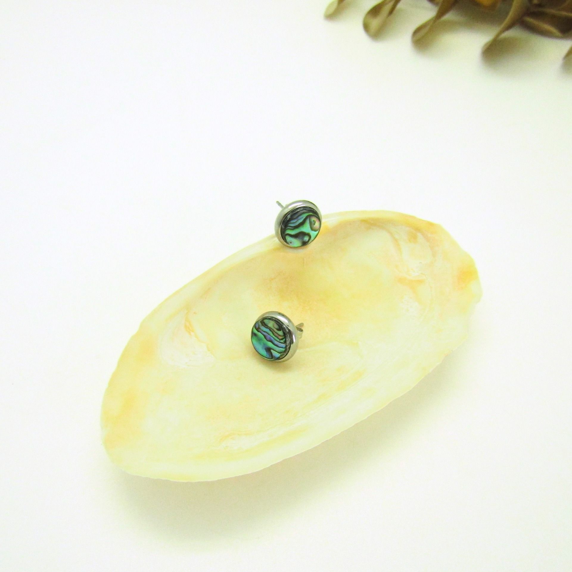 Puces d'oreilles en acier inox doré ou acier, avec un cabochon en Nacre Abalone aux reflets changeants. Faciles à associer.