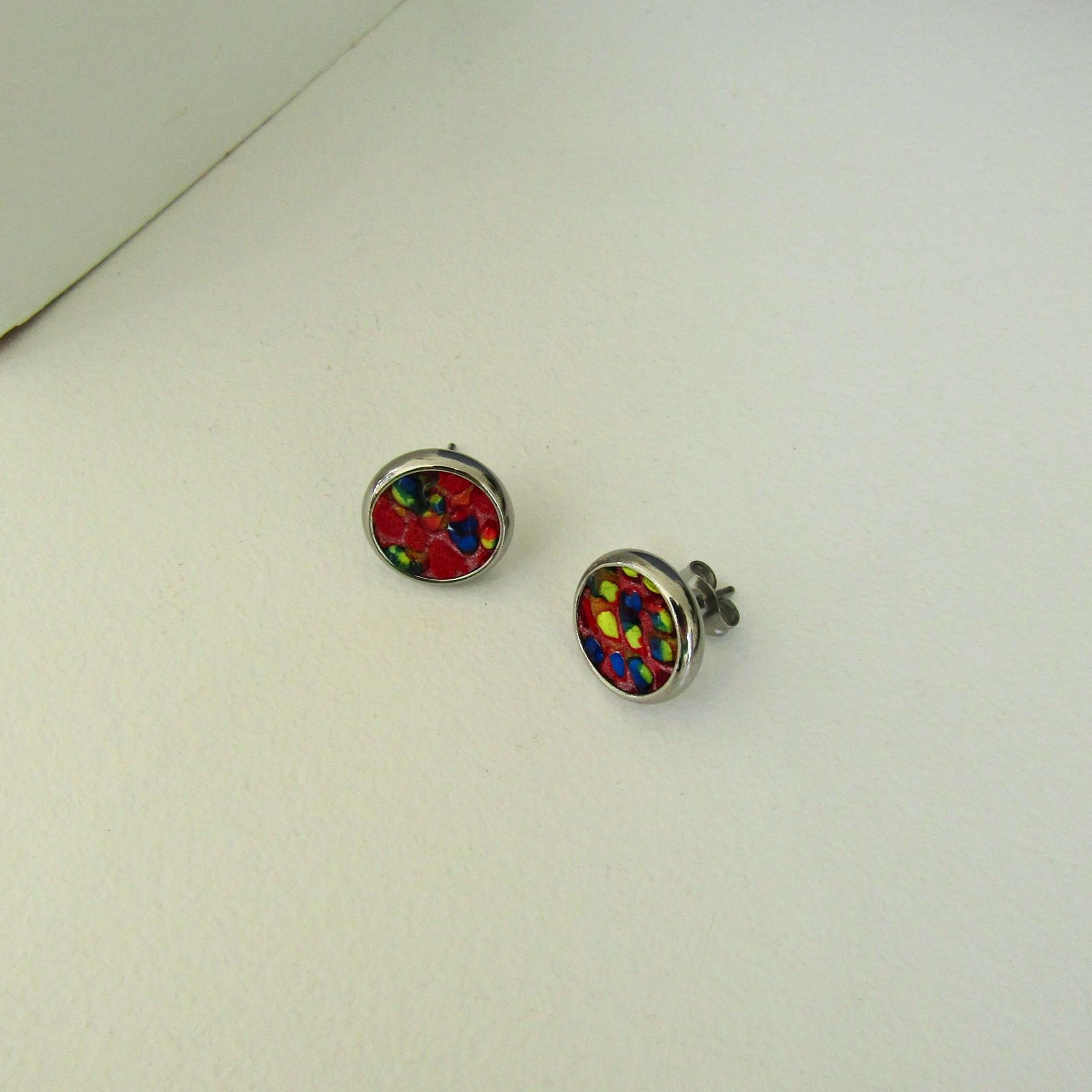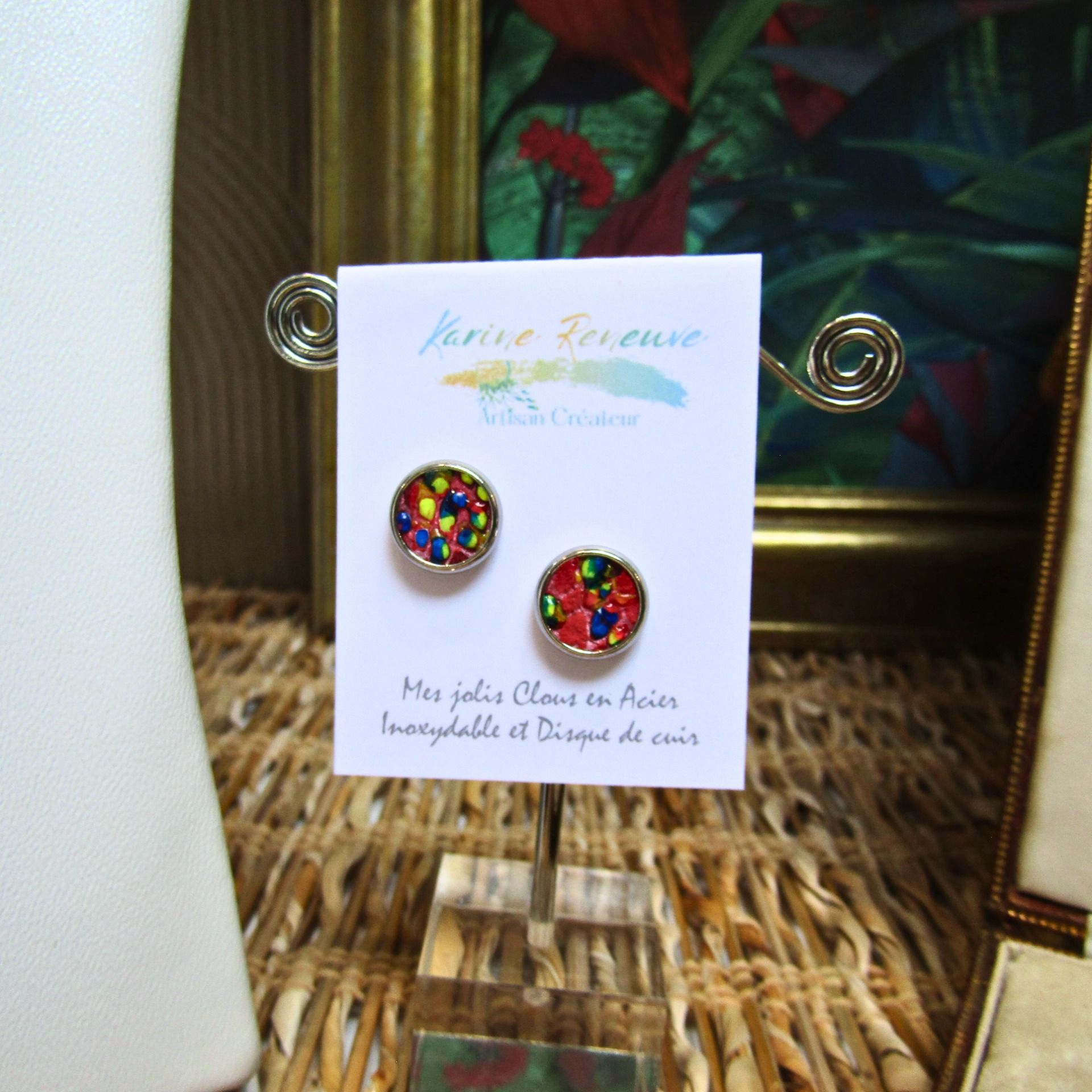 Toutes simples, à associer avec beaucoup de tenues, puces d'oreilles en acier inox ou acier doré (au choix) avec un petit disque de cuir fond rouge et petites taches multicolores à l'intérieur.