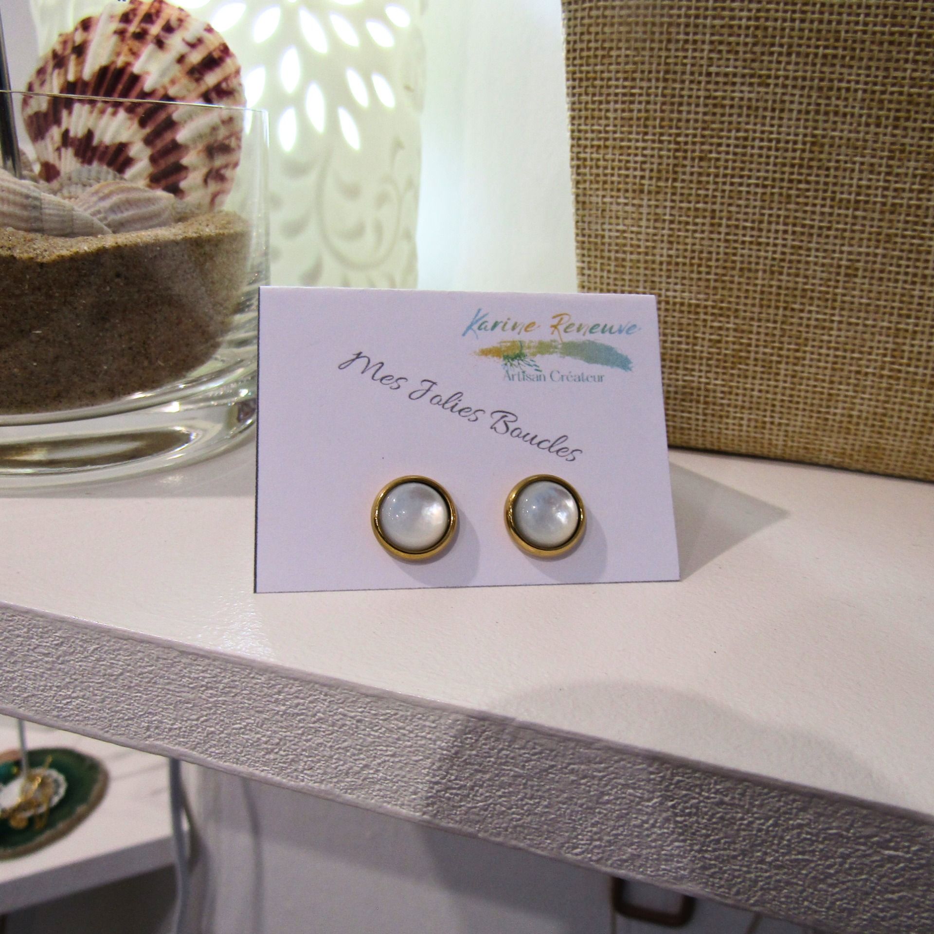 Intemporelles, les puces d'oreilles en acier inox doré (hypoallergénique) avec un joli cabochon rond en Nacre, sont féminines et faciles à associer.