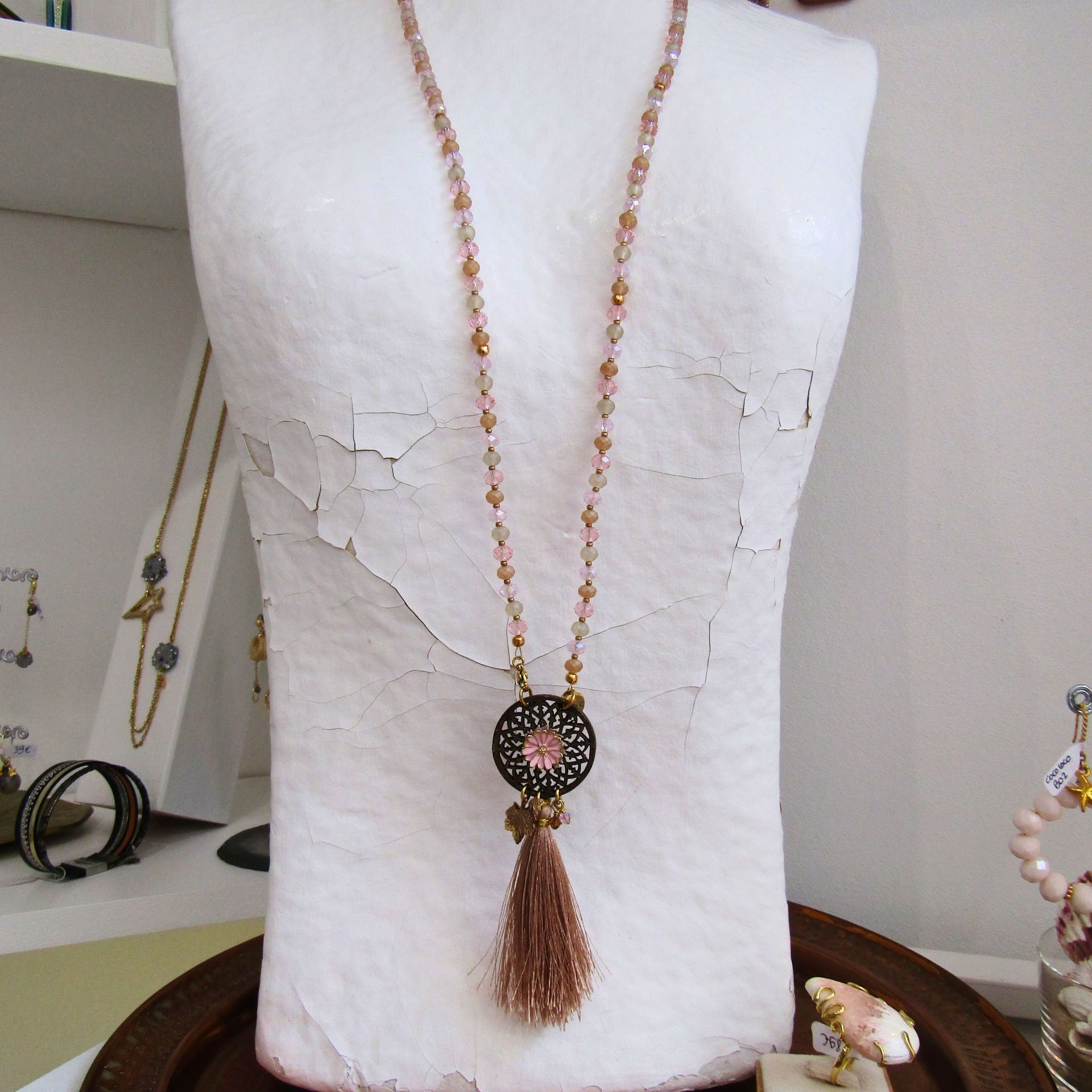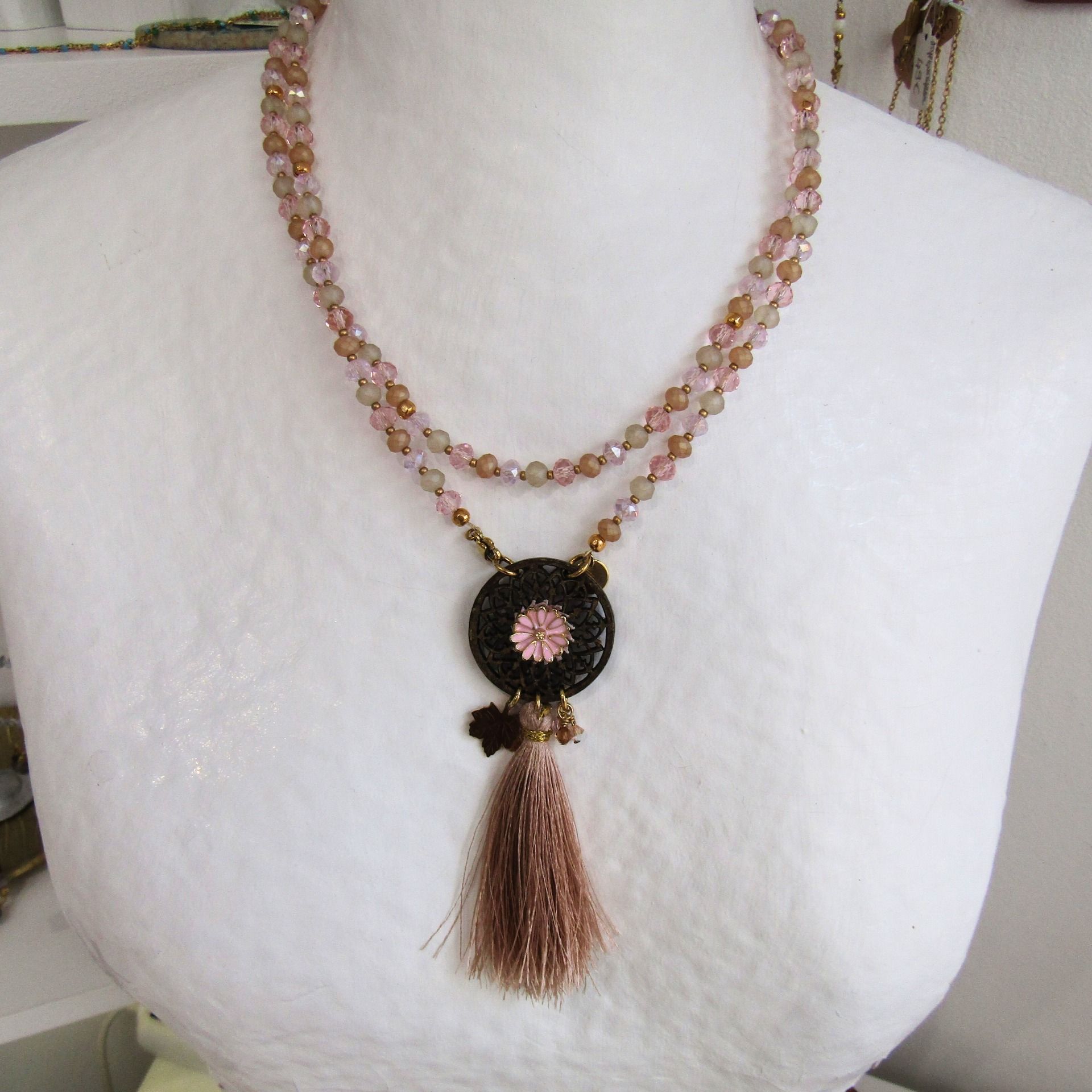 Sautoir de perles de verre de Bohême rose pâle et poudre, avec son motif de bois "Mandalla", fleur d'émail rose, perles de cristal de Swarovski, breloque feuille et pompon soyeux. Ce sautoir est délicat et féminin peut aussi être porté double tour.