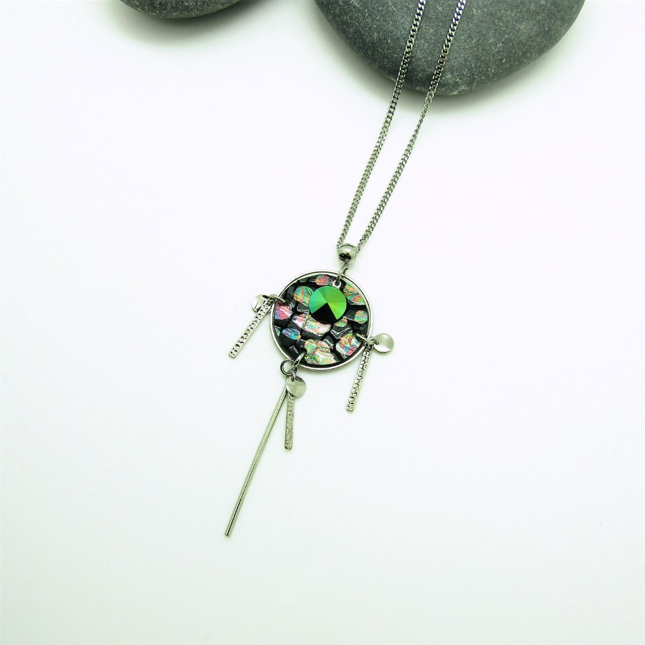 Collier Sautoir 60cm, pendentif rond 3cm en laiton rhodié et disque mobile de cuir noir motif gouttes, cristal "rivoli" 10mm "Scarabaéus green". La tige pendante mesure 4.5 cm. Chaîne fine et finitions en acier inoxydable.